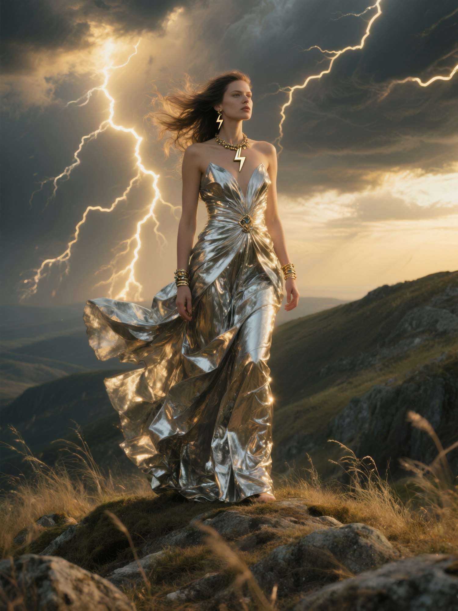 Editorial fine art photography, mythological and timeless aesthetic, dramatic golden sunlight breaking through storm clouds, glowing skin, strong chiaroscuro light, ethereal and divine atmosphere, ultra realistic, high resolution, cinematic shot of a woman standing on a hilltop, wearing a sculptural gown made of layered metallic fabrics reflecting lightning, adorned with jewelry shaped like thunderbolts, her hair blown back violently by the wind, composition dynamic and theatrical, evoking a goddess of storms, editorial yet mythological