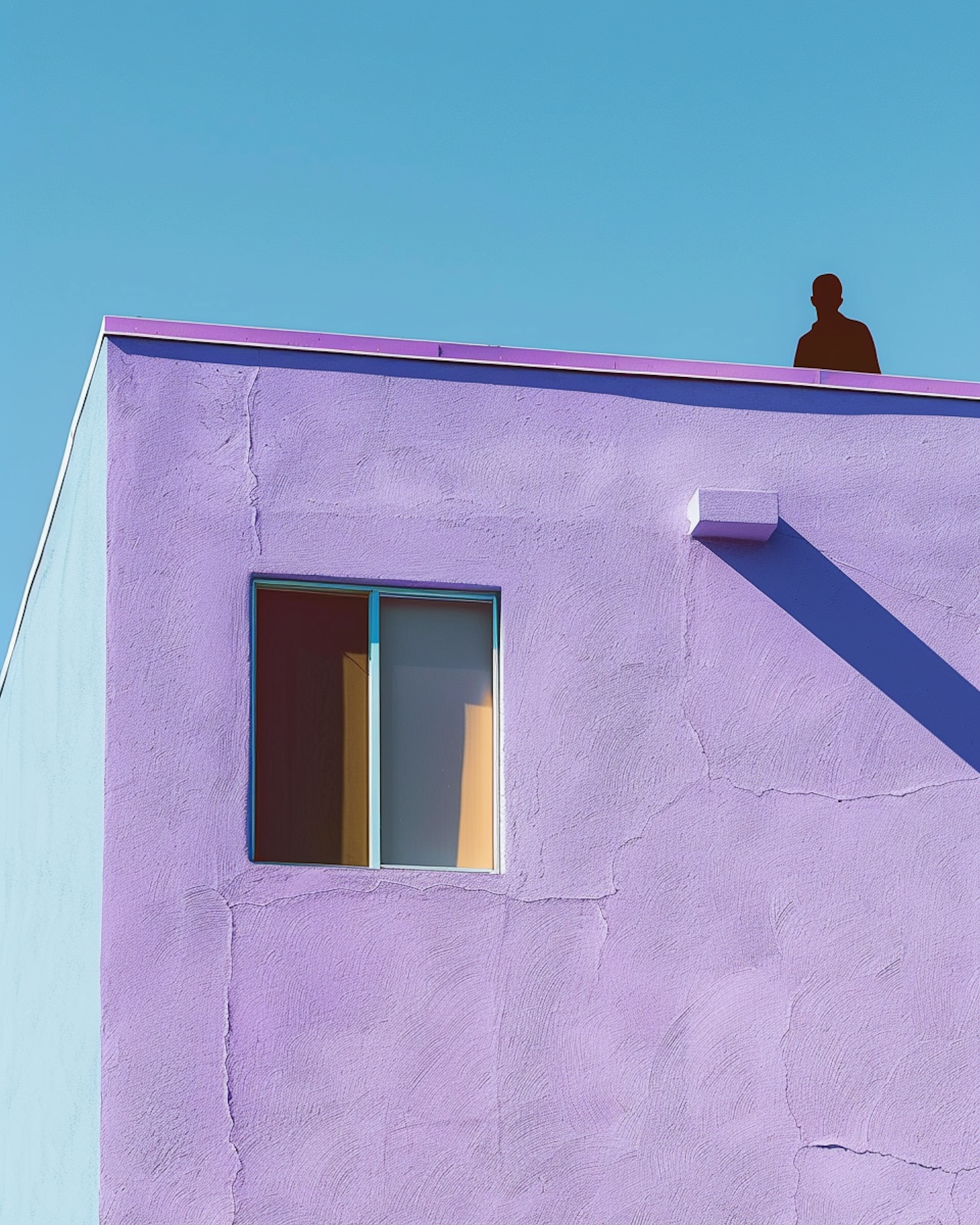 Minimalist purple building with a shadowy figure on the roof against a clear blue sky. Vibrant colors and intriguing composition.