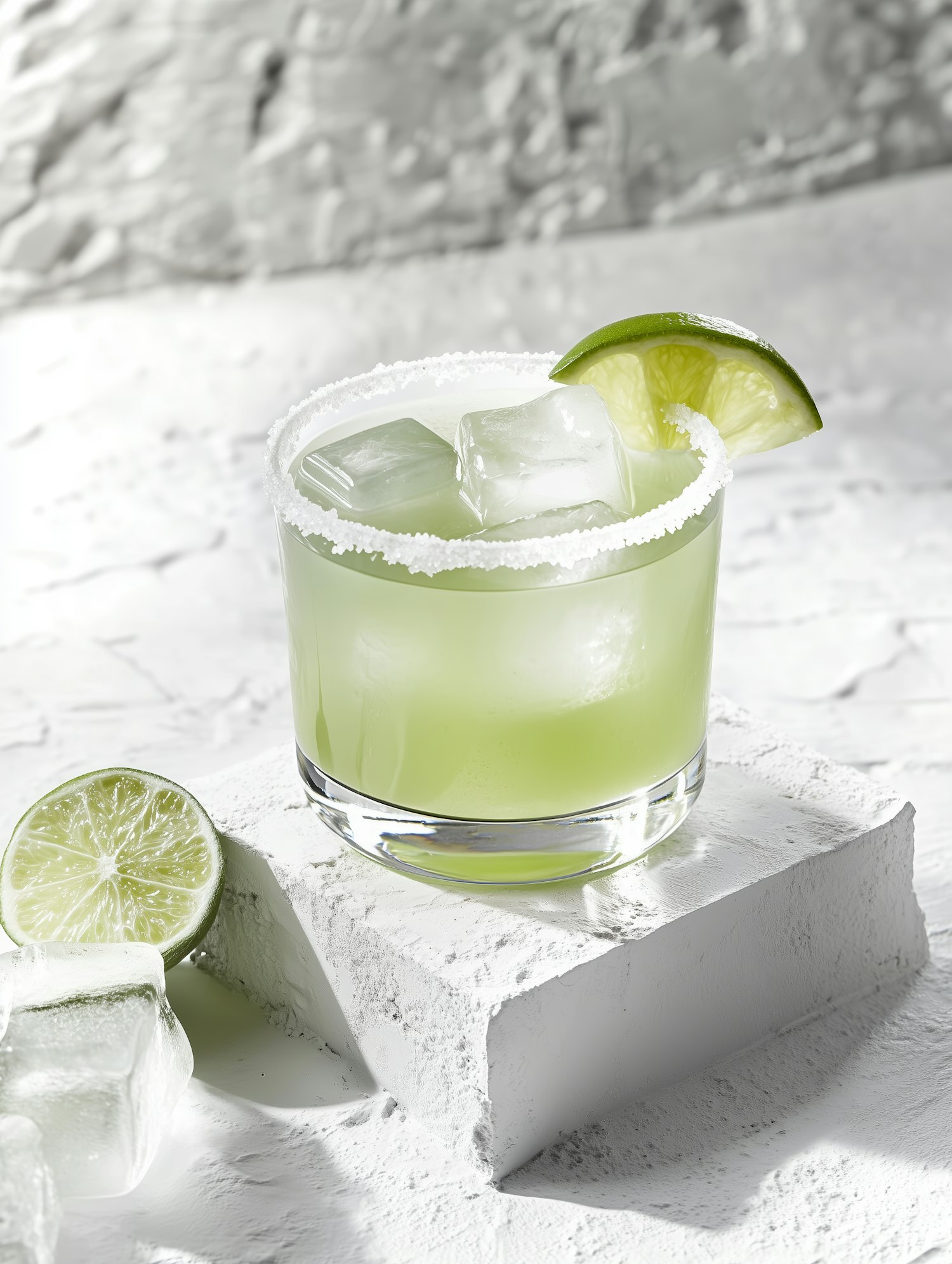 A vibrant lime cocktail with a salted rim, garnished with a lime wedge, served on a textured white surface with ice and lime accents.