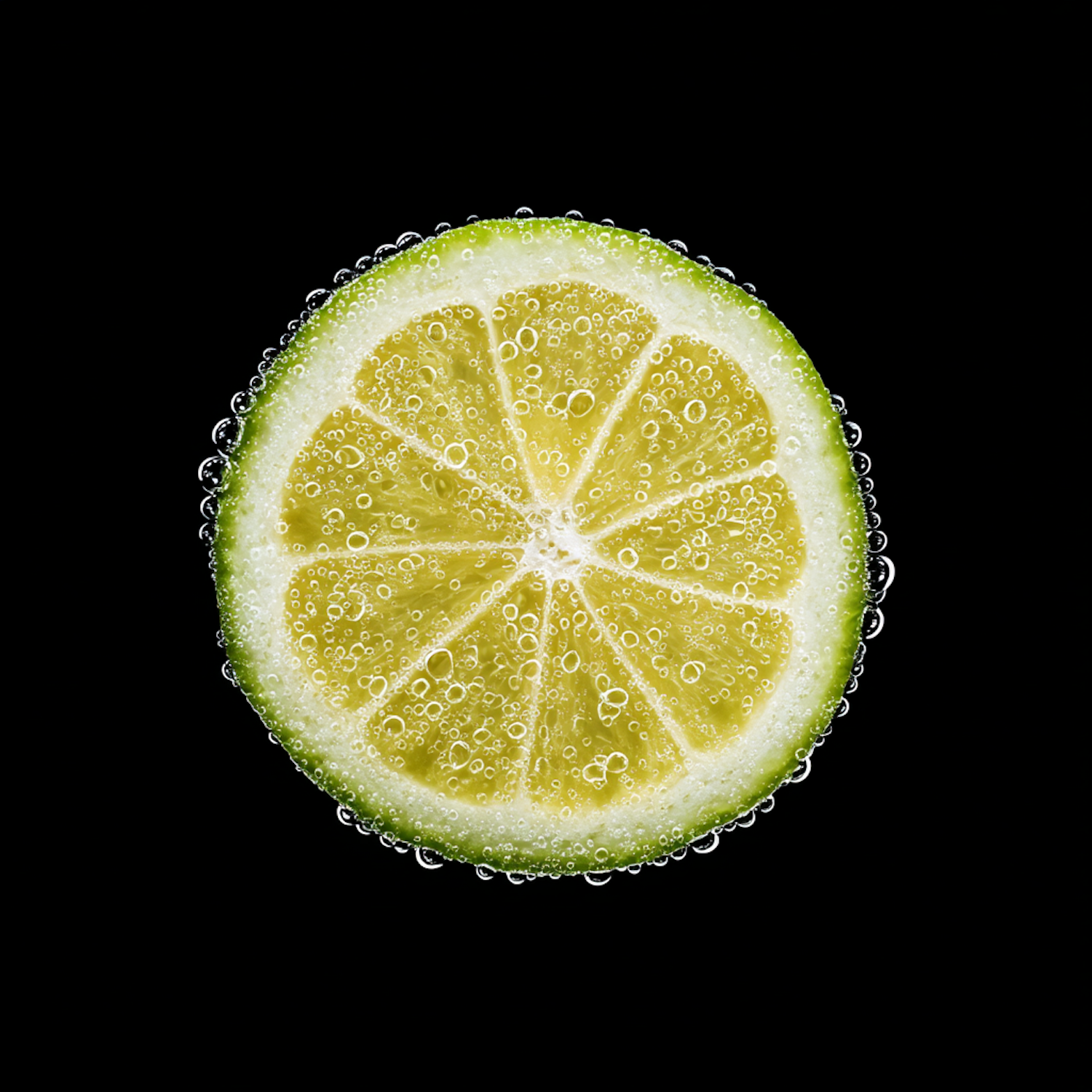 Close-up of a lime slice with bubbles on its surface, set against a black background, highlighting its vibrant colors and texture.