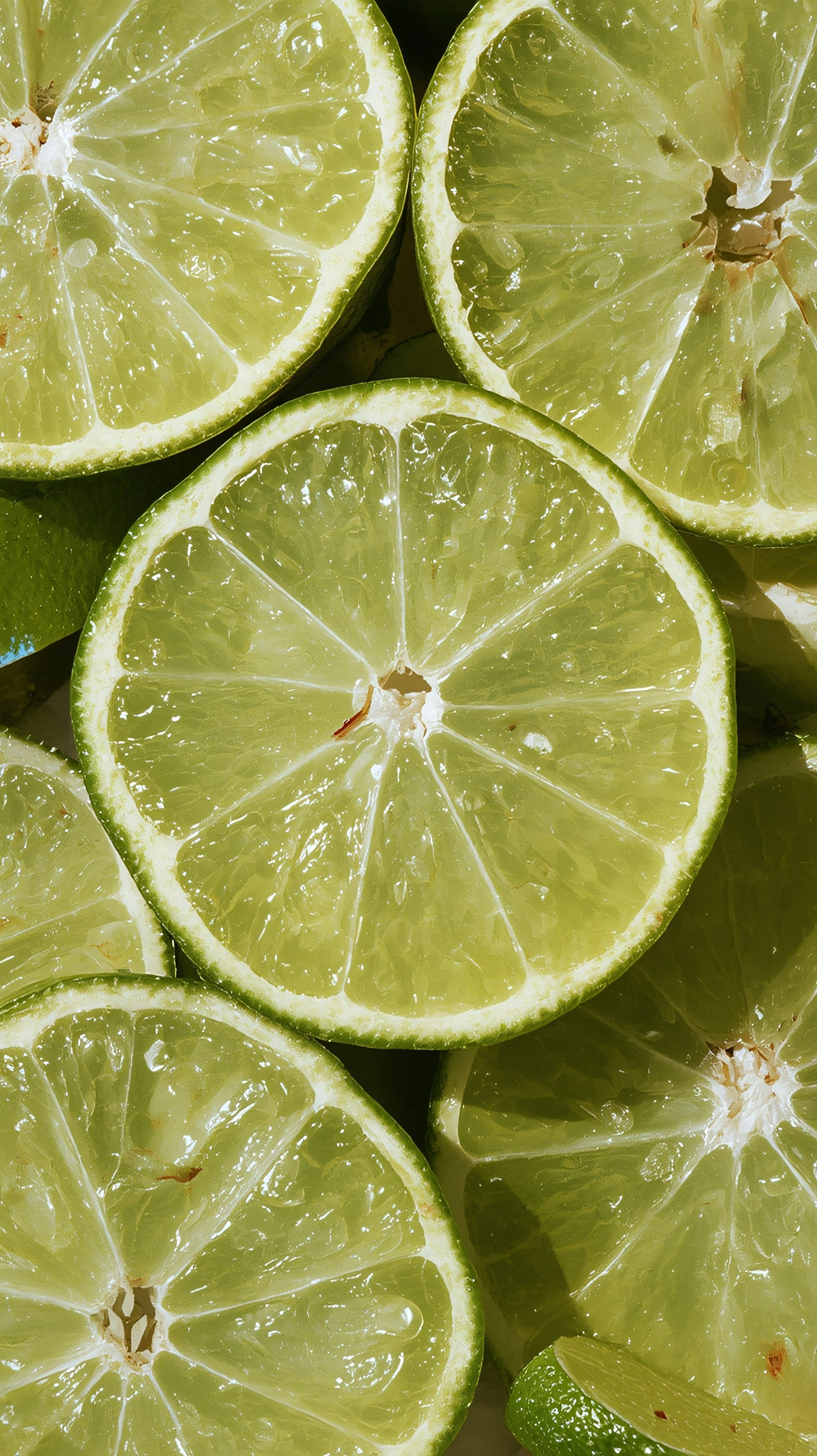 Close-up of fresh lime slices showcasing their vibrant green color and juicy texture, perfect for culinary or refreshing beverage themes.