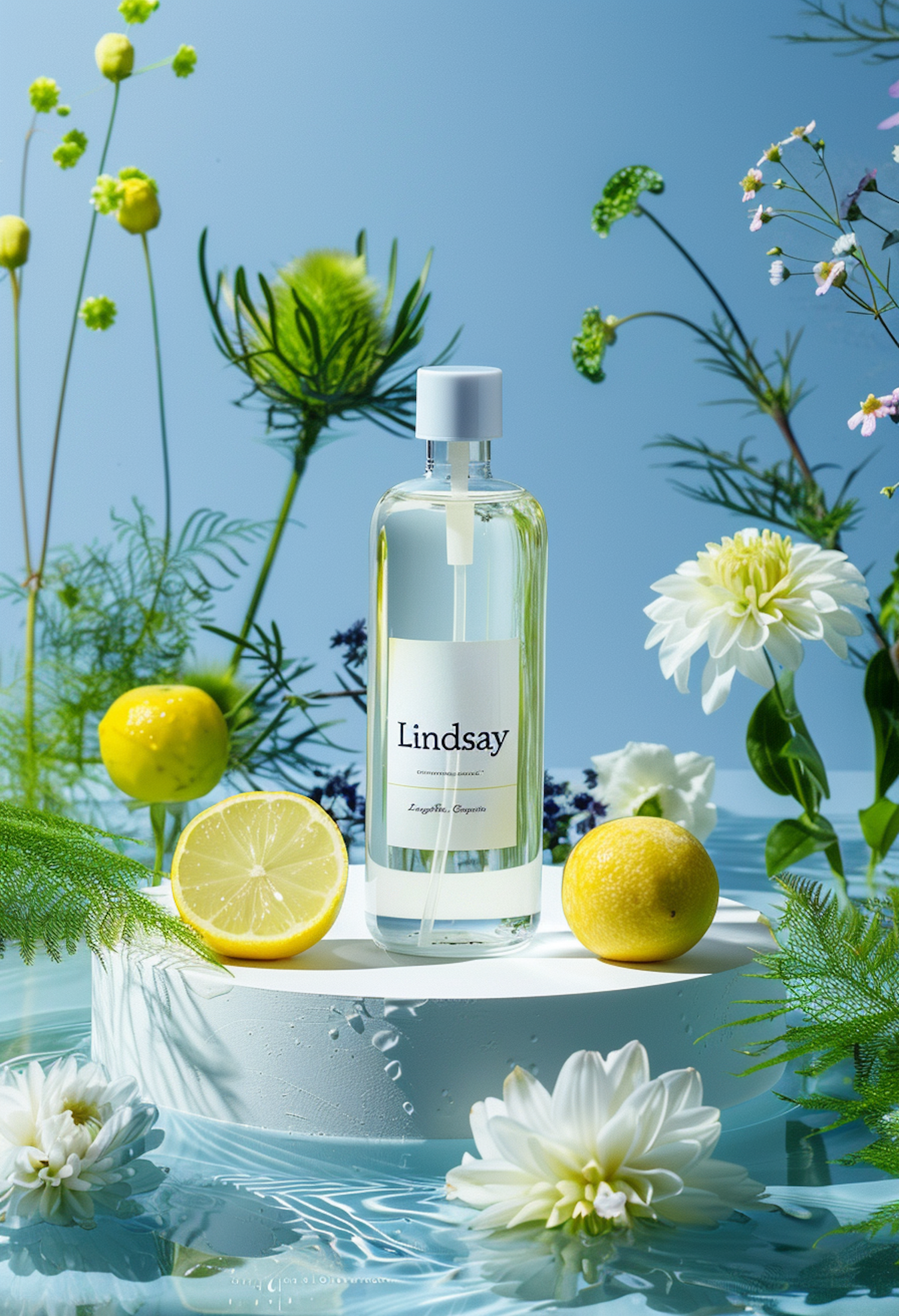 Elegant perfume bottle with lemons and flowers on a white pedestal, set against a serene blue background with water reflections.