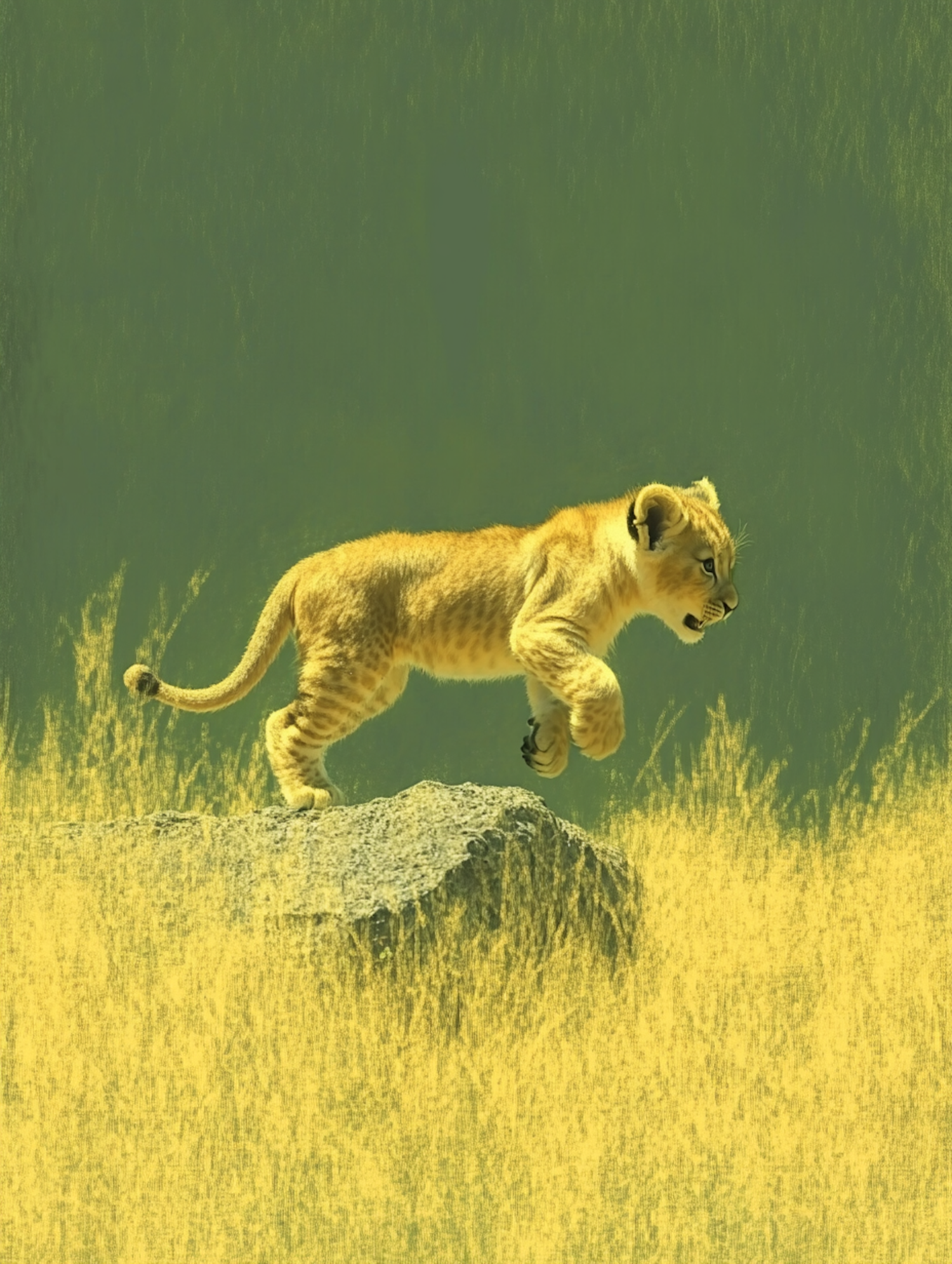 A lion cub leaps on a rock amidst golden grass, set against a muted green background, capturing the essence of wildlife playfulness.