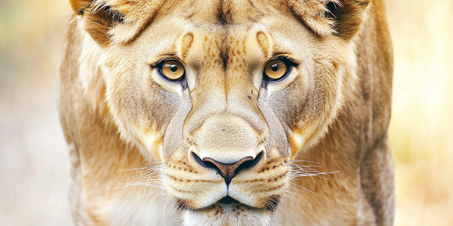Close-up of a lioness with intense golden eyes and detailed fur texture, set against a blurred background for dramatic focus.