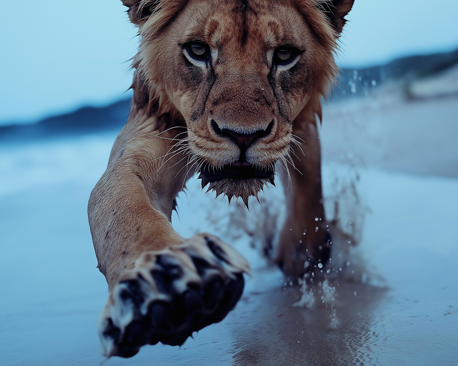 A lioness strides powerfully on a wet beach, her piercing gaze locked on the viewer, with water splashing around her extended paw.