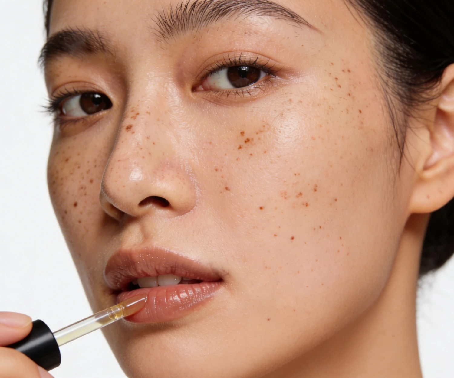 Close-up of a person with freckled skin applying a liquid product to their lips using a dropper, showcasing natural beauty.