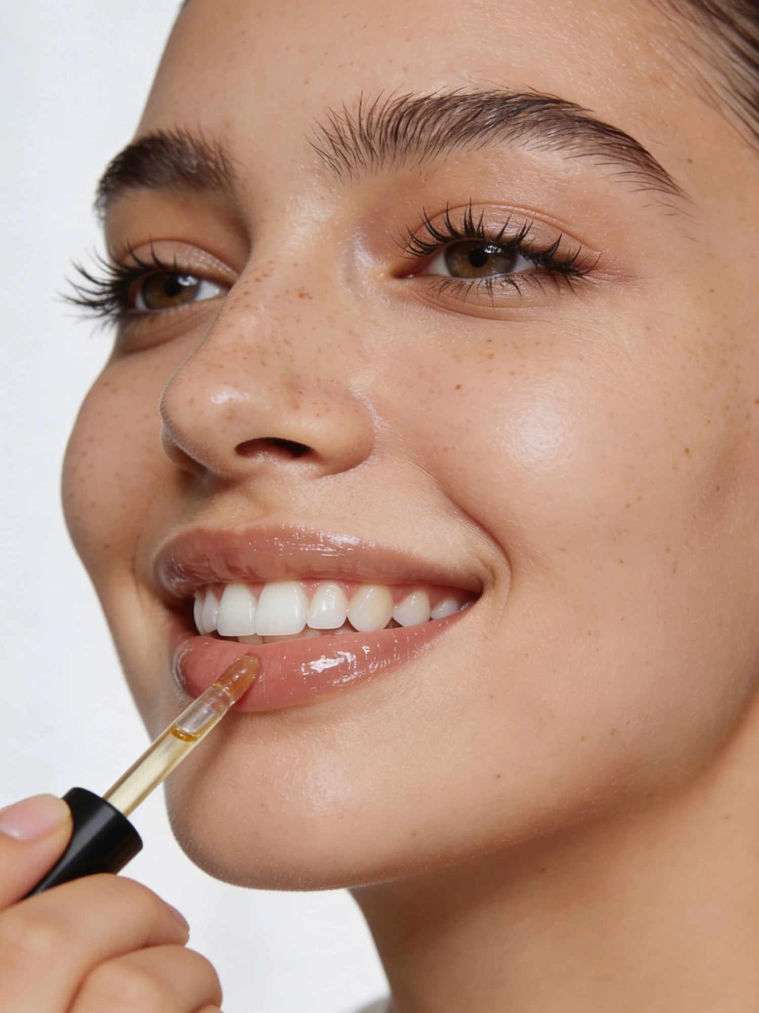 Close-up of a person applying clear lip gloss with a dropper, showcasing natural beauty and skincare focus.