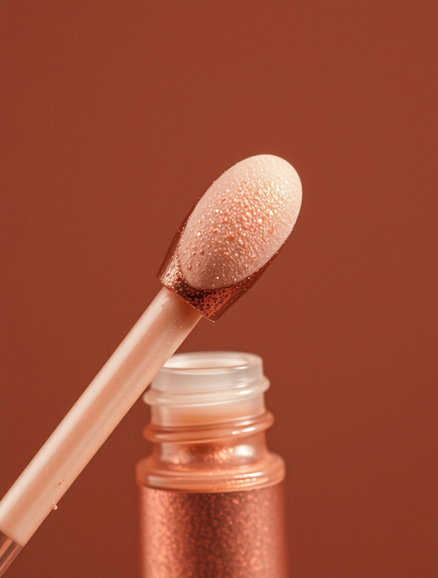 Close-up of a shimmering peach lip gloss applicator with a copper bottle against a warm brown background.