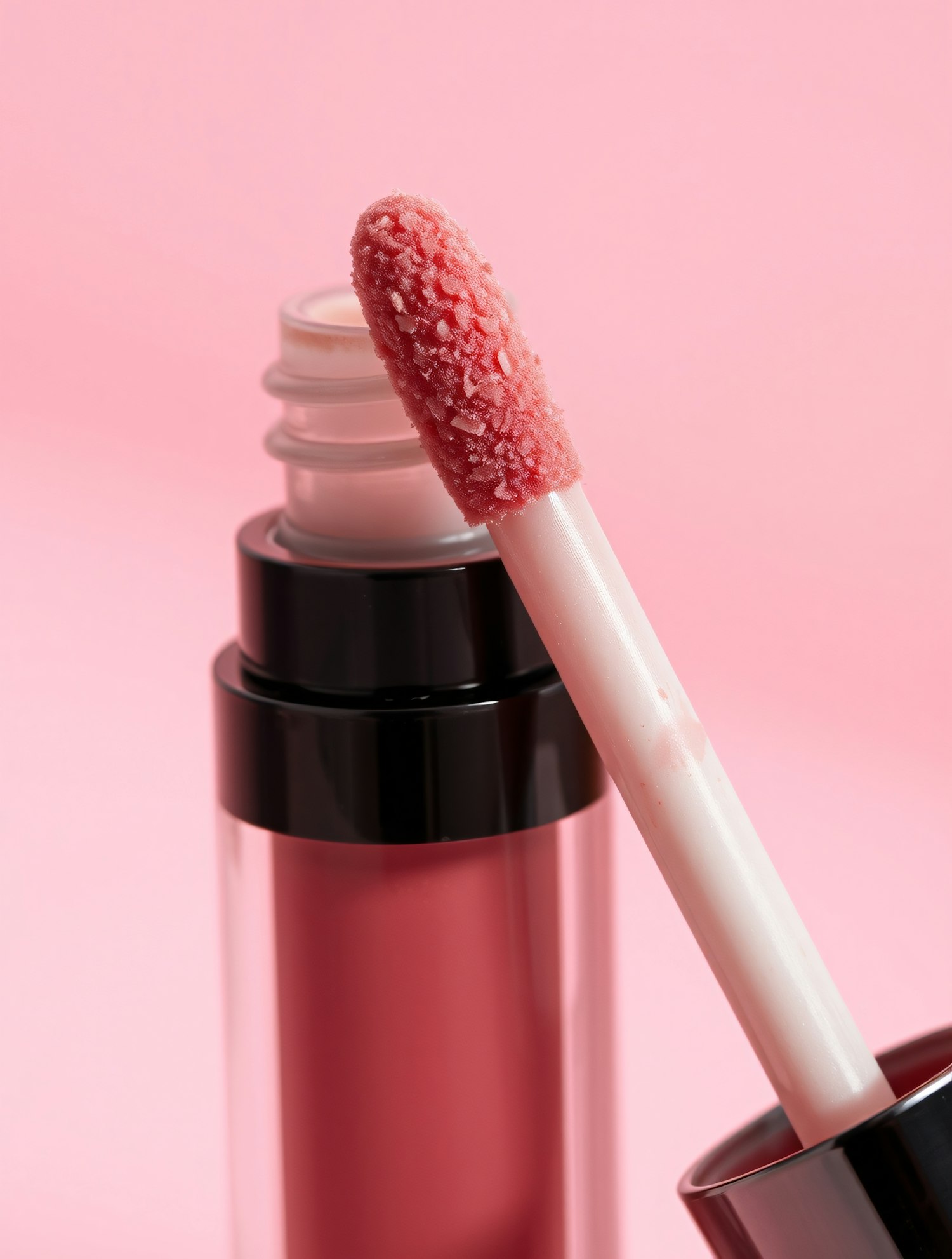 Close-up of a pink lip gloss applicator with a textured tip, set against a soft pink background. Elegant and stylish design.
