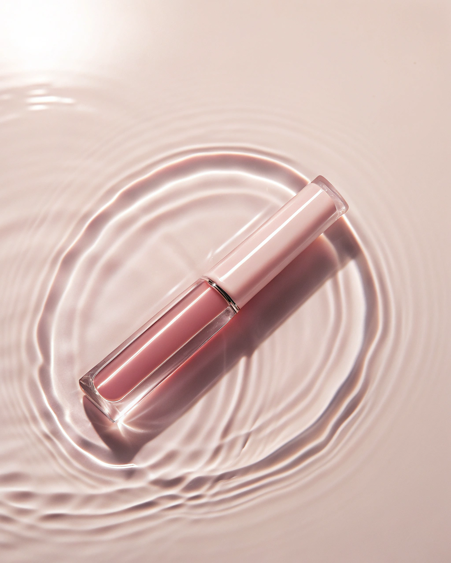 Elegant pink lip gloss tube on a reflective surface with gentle ripples, creating a serene and sophisticated aesthetic.