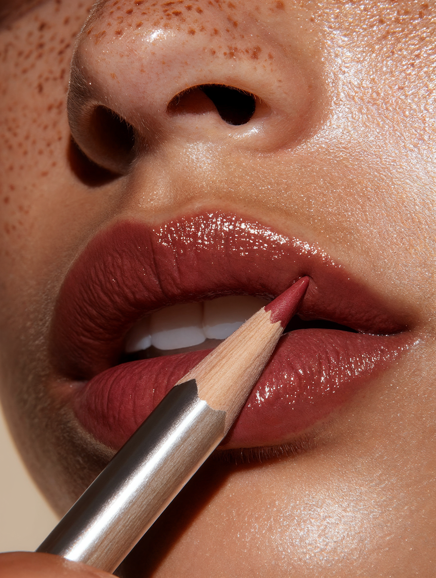 Close-up of glossy mauve lips being outlined with a matching lip liner, surrounded by freckled, glowing skin.