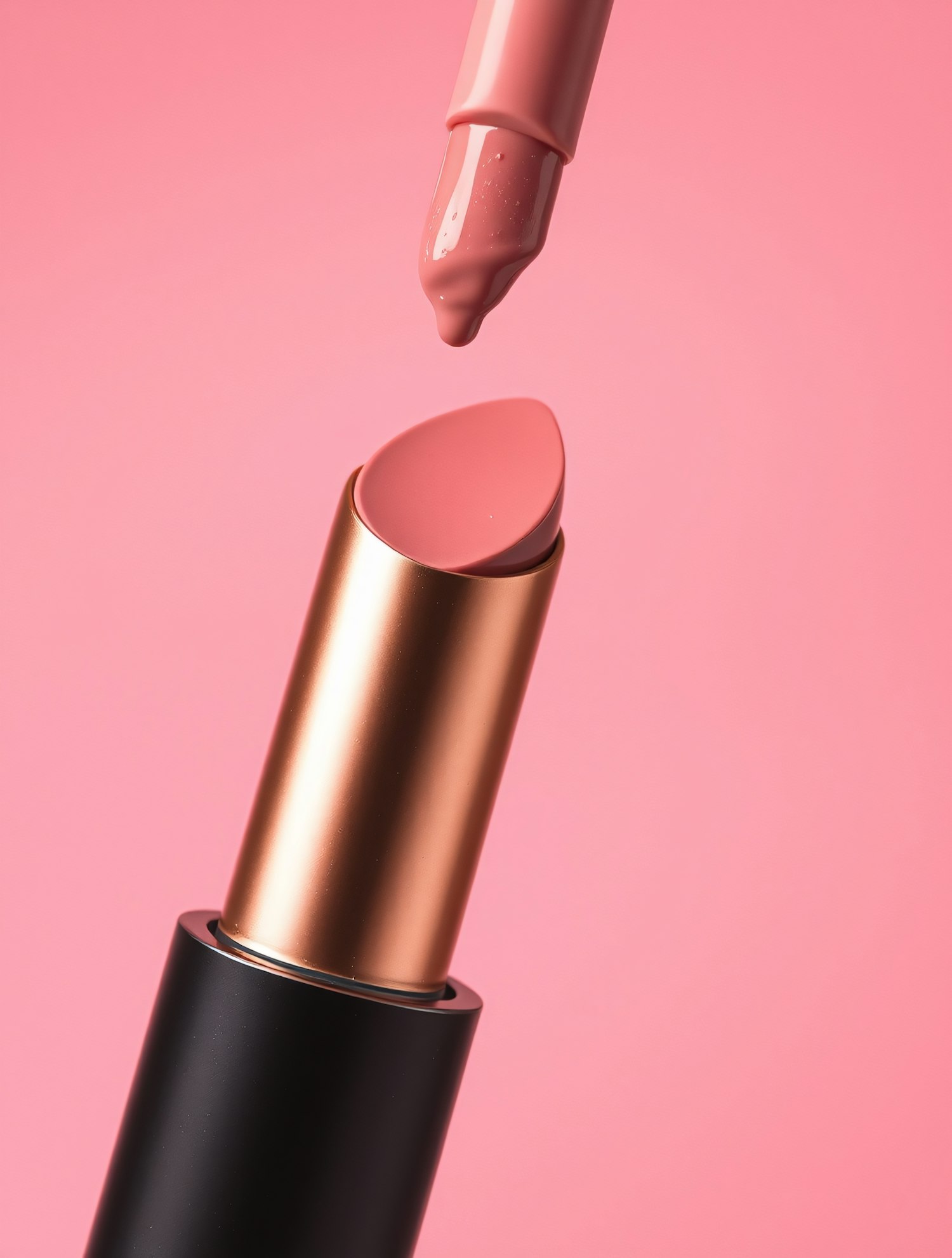 Close-up of pink lipstick and gloss applicator on a pink background, showcasing beauty and elegance.