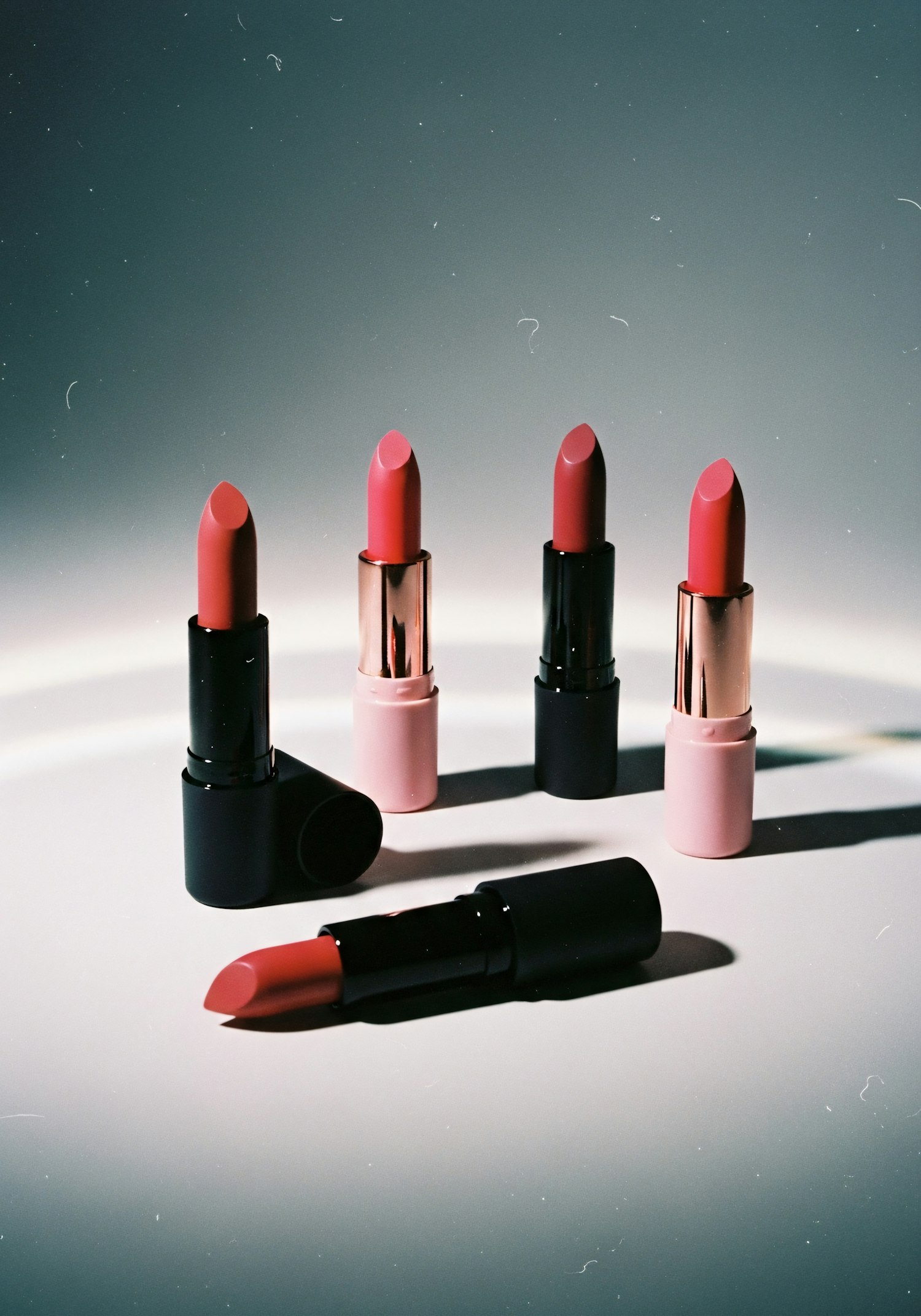A stylish arrangement of pink and black lipsticks on a gradient background, showcasing their elegant design and warm pink shades.
