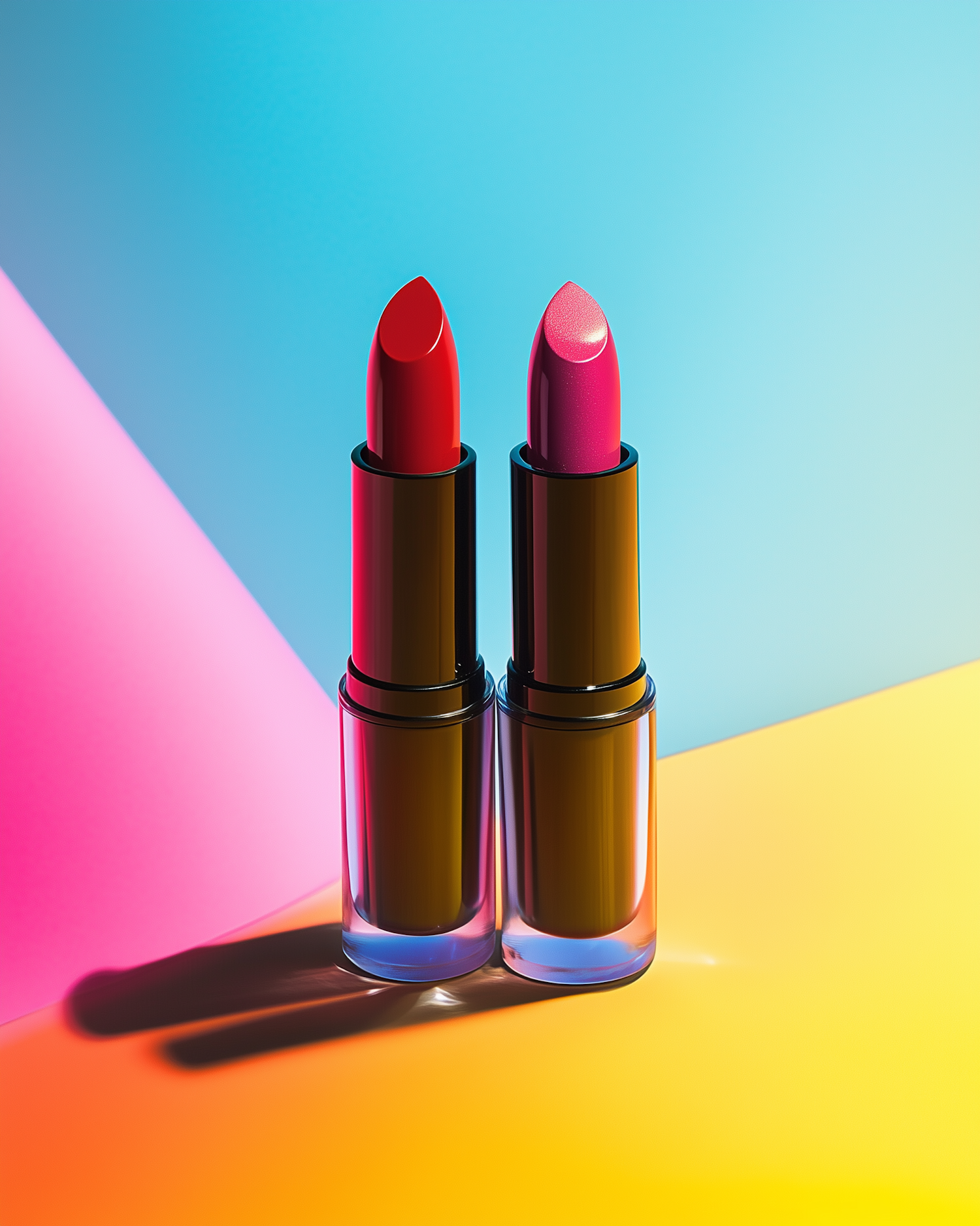 Two vibrant lipsticks in red and pink against a colorful gradient background, showcasing luxury and style.