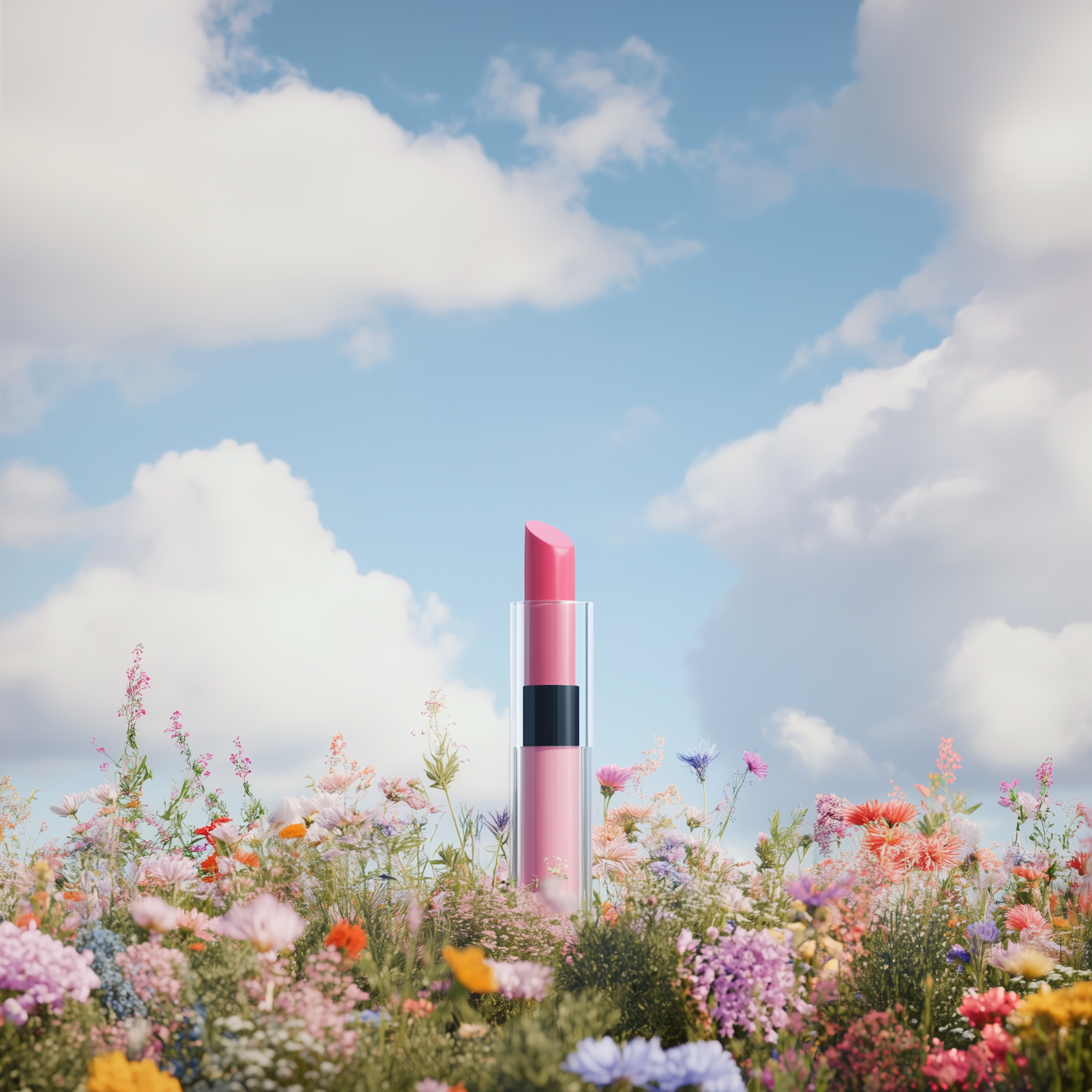 Vibrant pink lipstick amidst colorful wildflowers under a clear blue sky, creating a striking and elegant visual contrast.