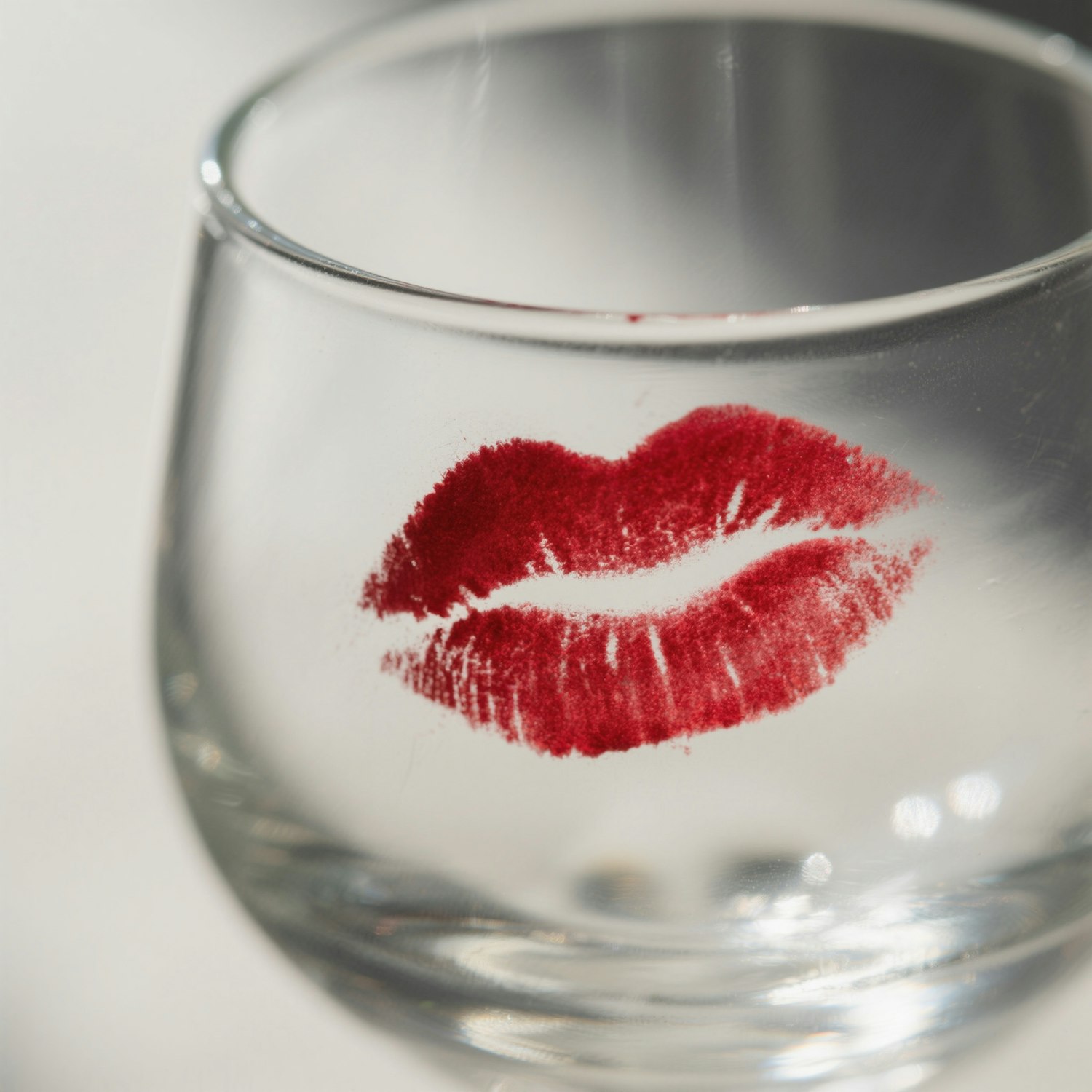 Close-up of a clear glass with a vivid red lipstick mark, showcasing texture and detail against a softly blurred background.