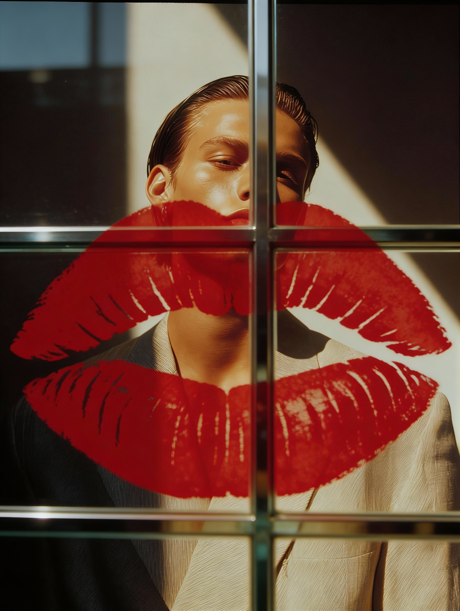 A striking image of a person behind a glass pane with a bold red lipstick mark, creating a dramatic and artistic visual effect.