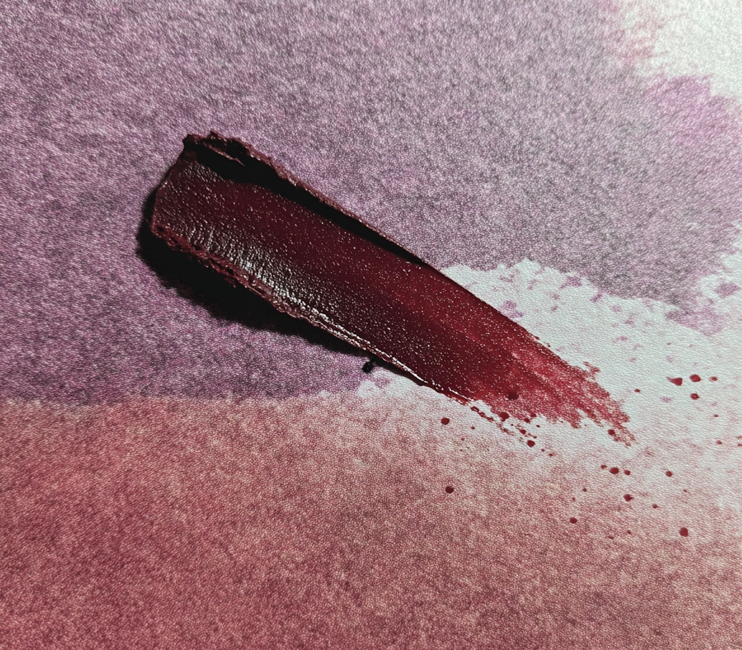 A smear of deep red lipstick on a textured purple and pink gradient background, showcasing its rich color and glossy texture.