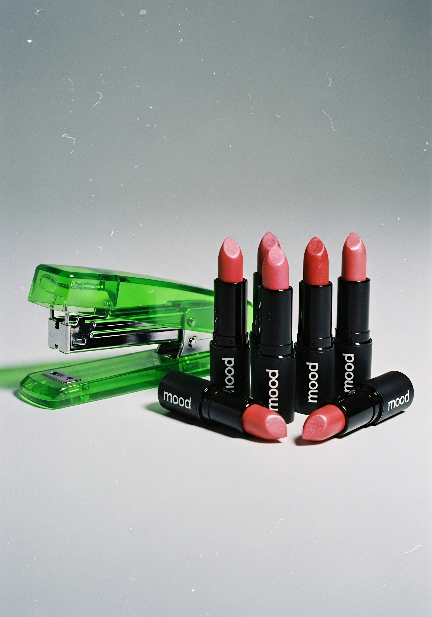 A set of pink lipsticks in black tubes with a green stapler on a neutral background, showcasing vibrant colors and sleek design.