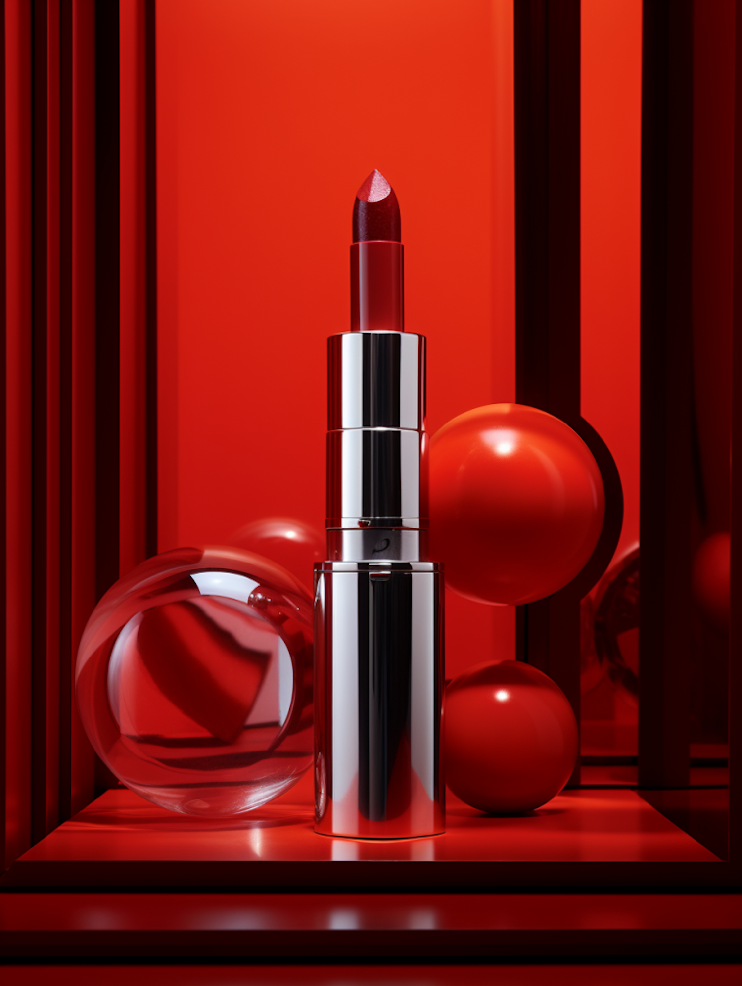 Luxurious red lipstick in a sleek silver tube, set against a vibrant red background with glossy spheres and reflective surfaces.