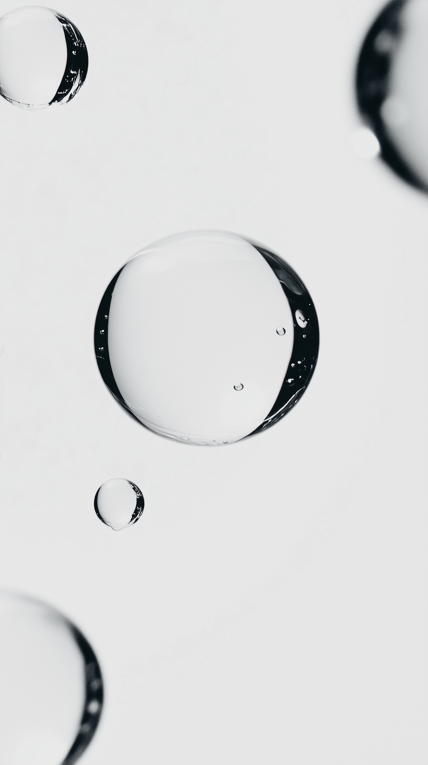 Close-up of transparent liquid droplets on a light gray background, showcasing their glossy, spherical shapes and minimalistic elegance.