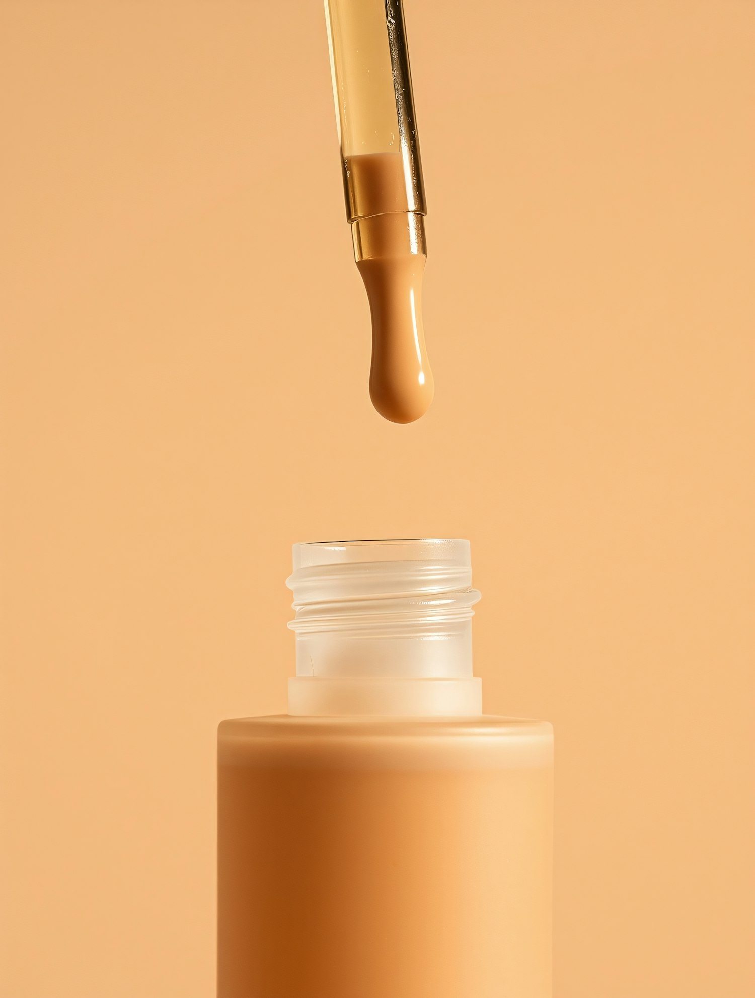 Minimalist close-up of a beige liquid foundation dropper and frosted bottle on a warm beige background, perfect for beauty branding.