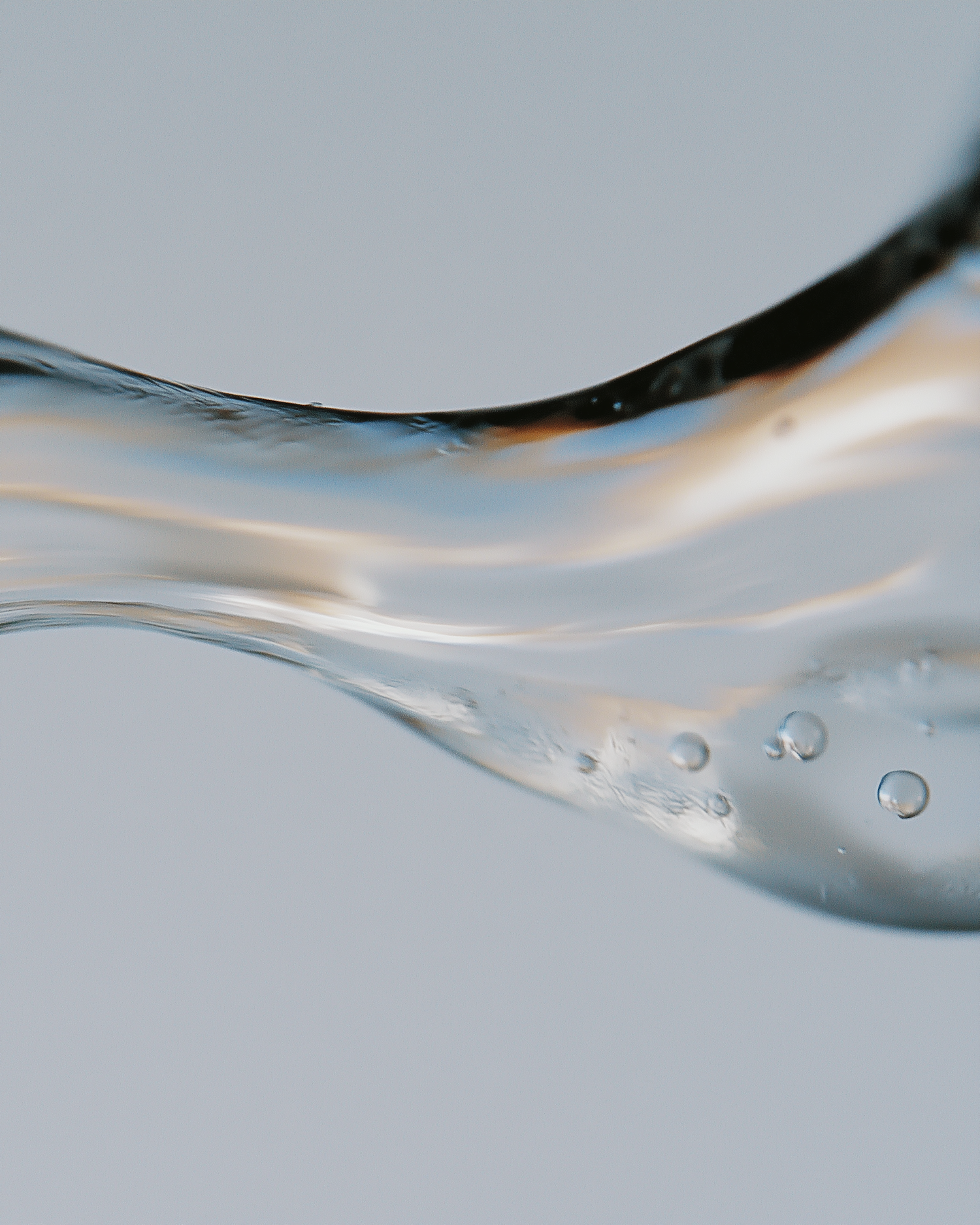 Close-up of a transparent liquid with air bubbles, reflecting soft light in golden and silvery tones against a neutral background.