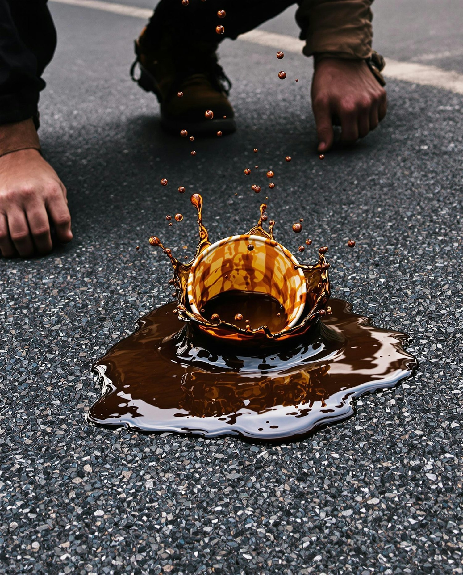 Dramatic splash of golden brown liquid on asphalt with hands nearby, highlighting a dynamic moment of interaction or observation.