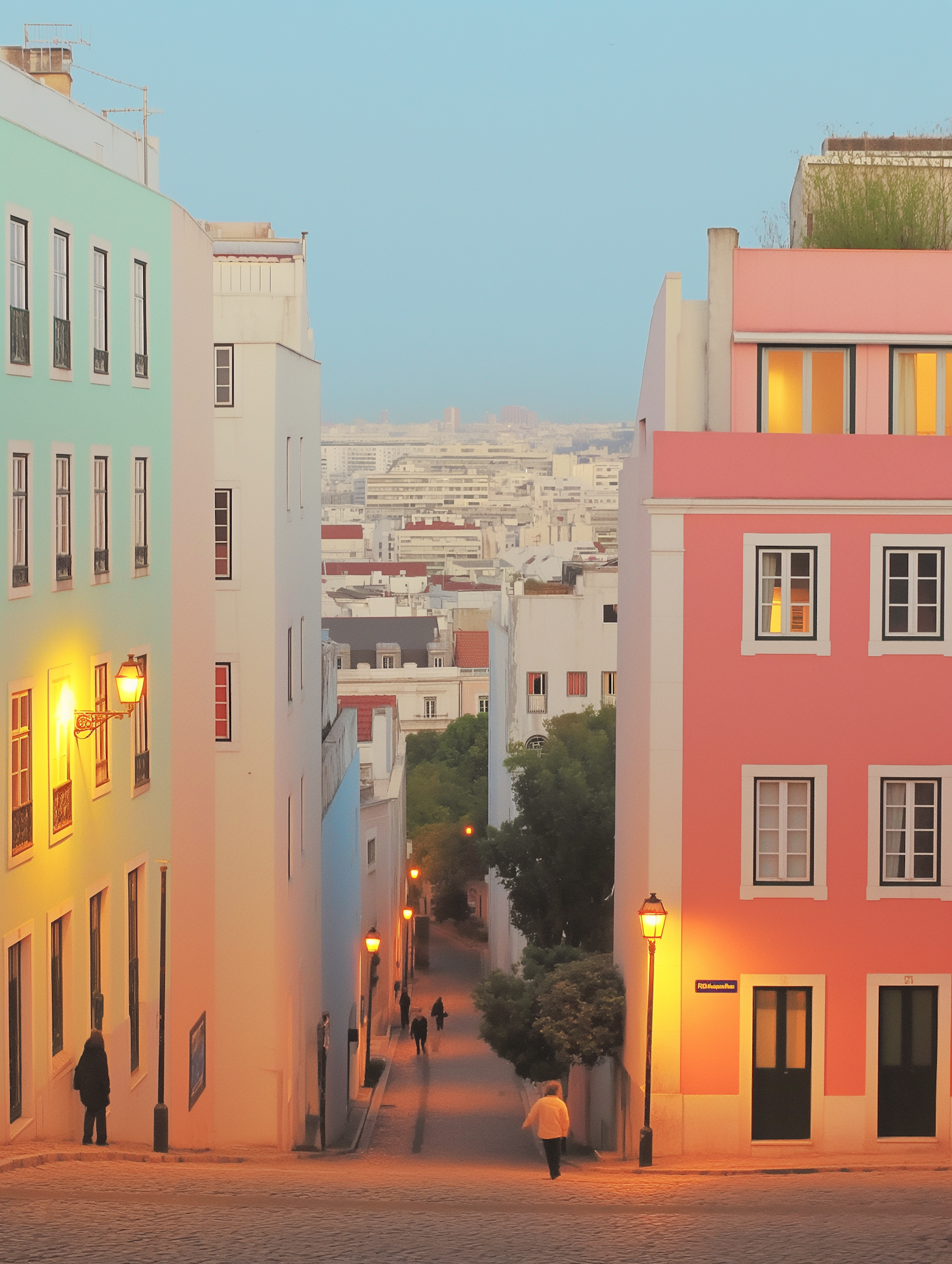 Charming pastel buildings line a cobblestone street, leading to a distant cityscape under a clear blue sky. Warm streetlights illuminate the scene.