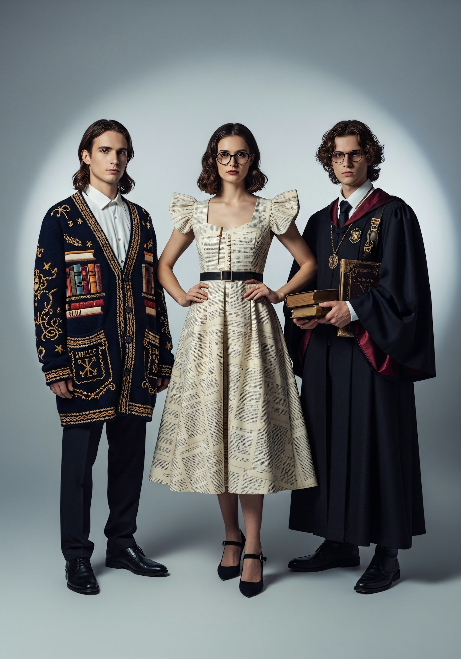 Three individuals in literary-themed outfits, including a text-printed dress and academic robes, pose in a studio setting.