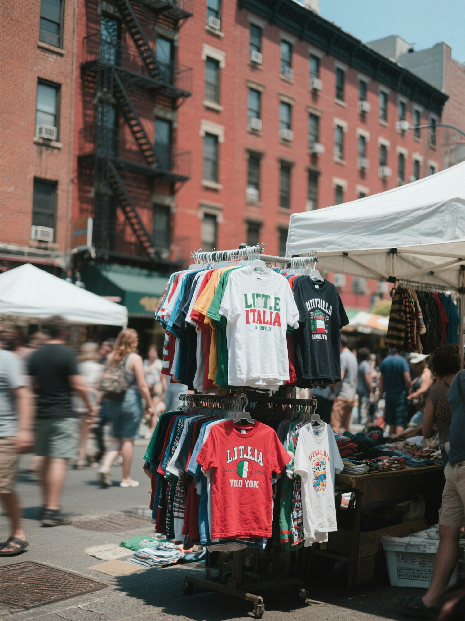 Street market in Little Italy with colorful t-shirts on display, bustling crowd, and iconic red brick buildings in the background.