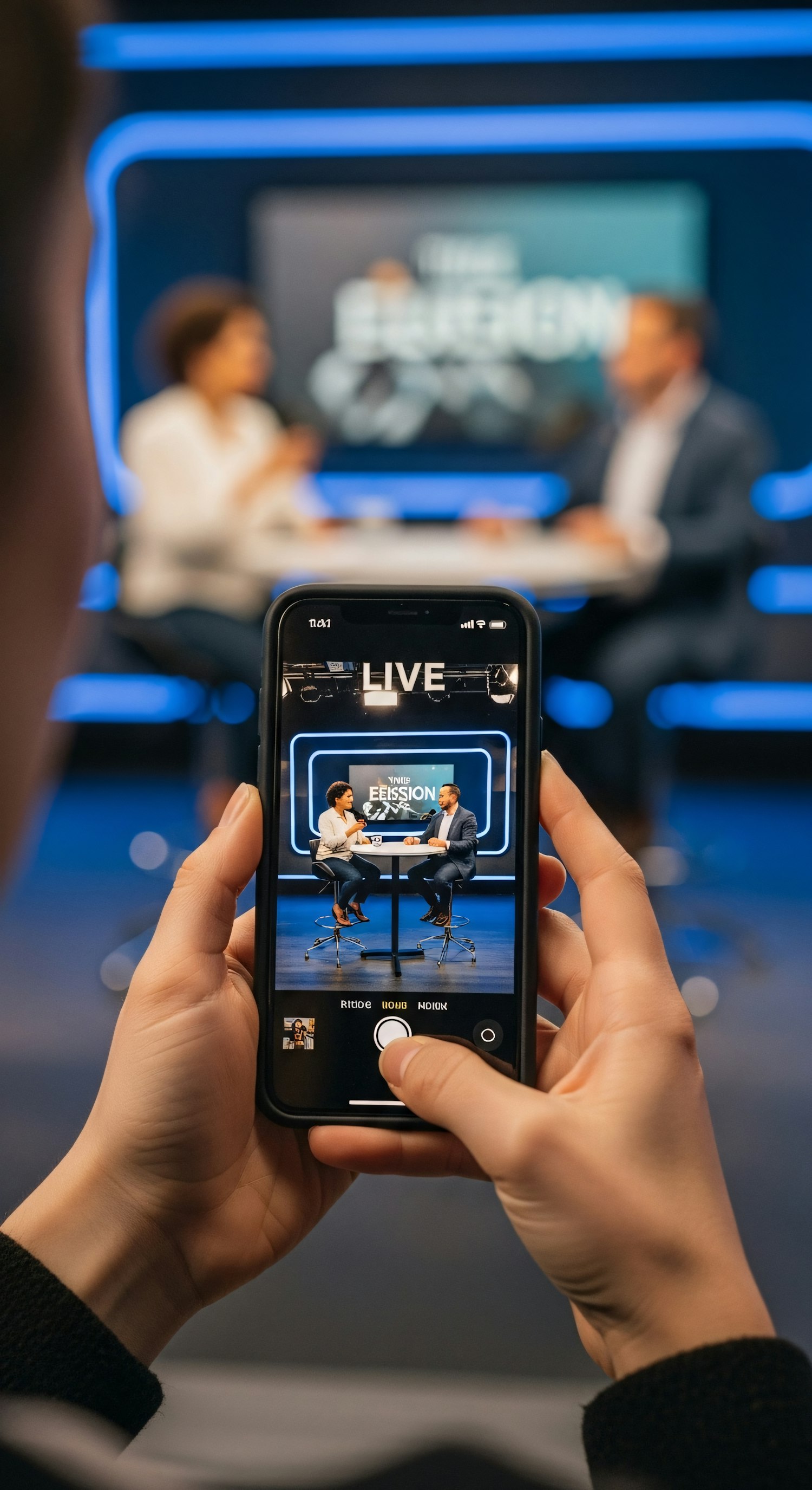 A person captures a live broadcast on their phone, showing two people in a modern studio with blue lighting. The phone screen is in focus.