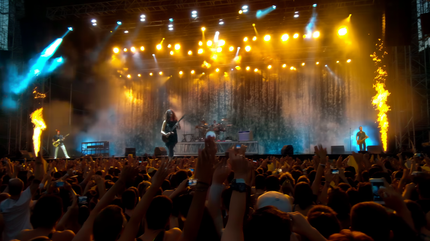Energetic concert scene with bright lights, flames, and a lively crowd capturing the moment. Band performs on stage with dynamic lighting.