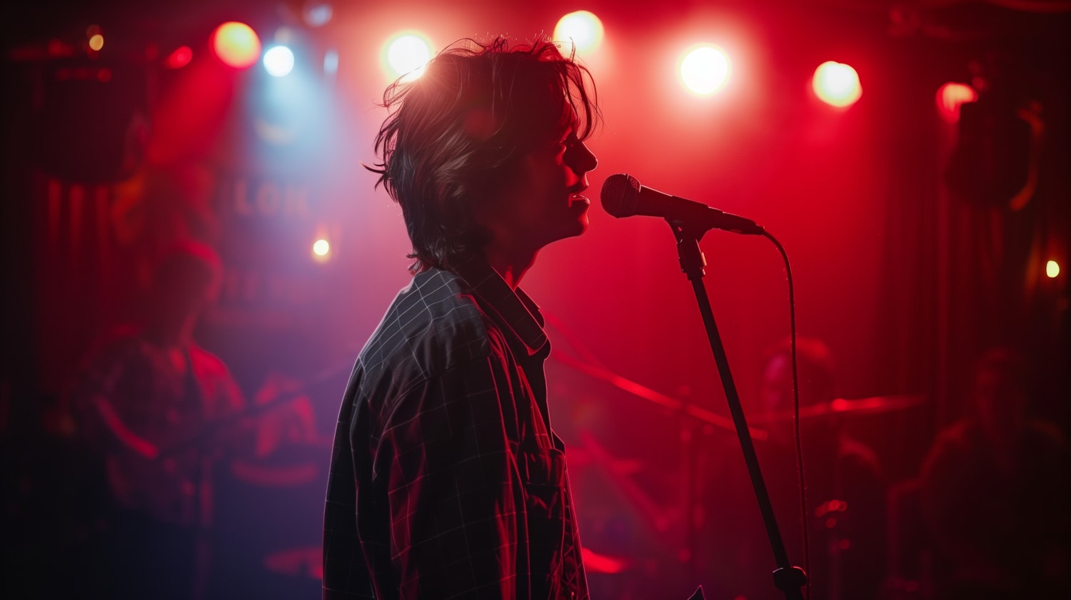 Young man performing on stage under red lights, creating an intimate and energetic live music atmosphere.