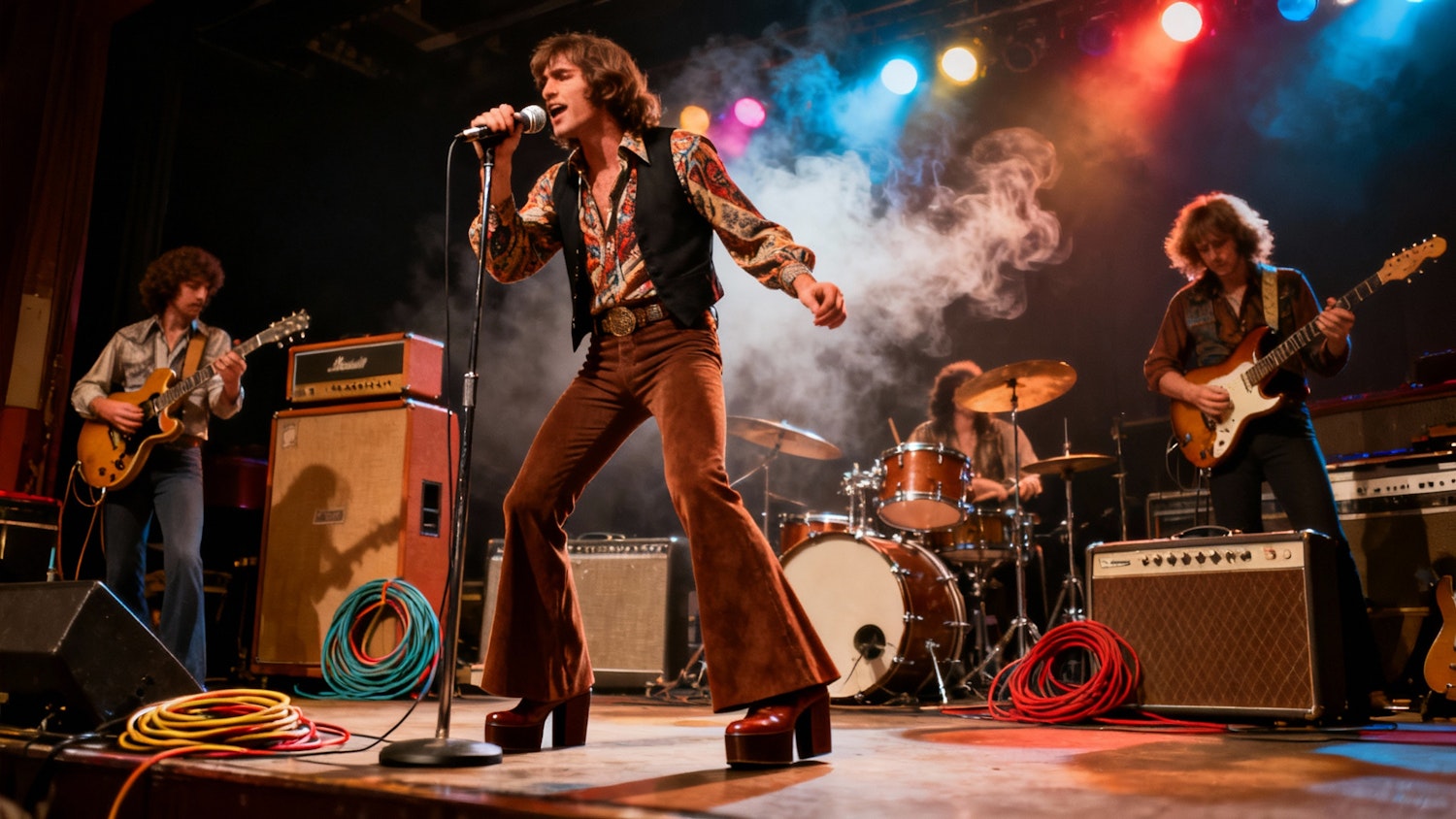 A retro rock band performing on stage with vibrant lighting, featuring a dynamic lead singer and energetic musicians.