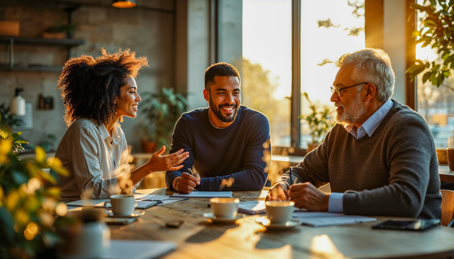 Three diverse individuals in a sunlit room engage in a lively discussion around a wooden table, surrounded by plants and warm light.