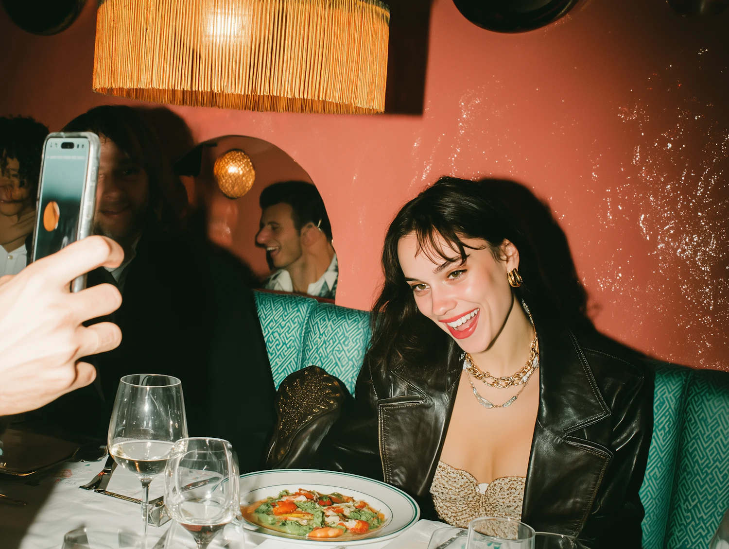 A cheerful dinner gathering with friends, featuring a smiling woman in a leather jacket, vibrant food, and warm restaurant lighting.