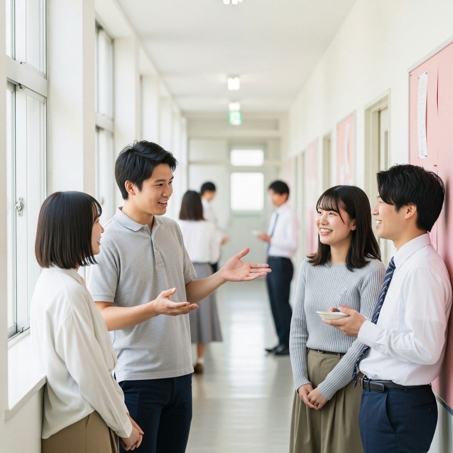 A group of young adults chatting in a bright hallway, with natural light and bulletin boards in the background, creating a lively atmosphere.
