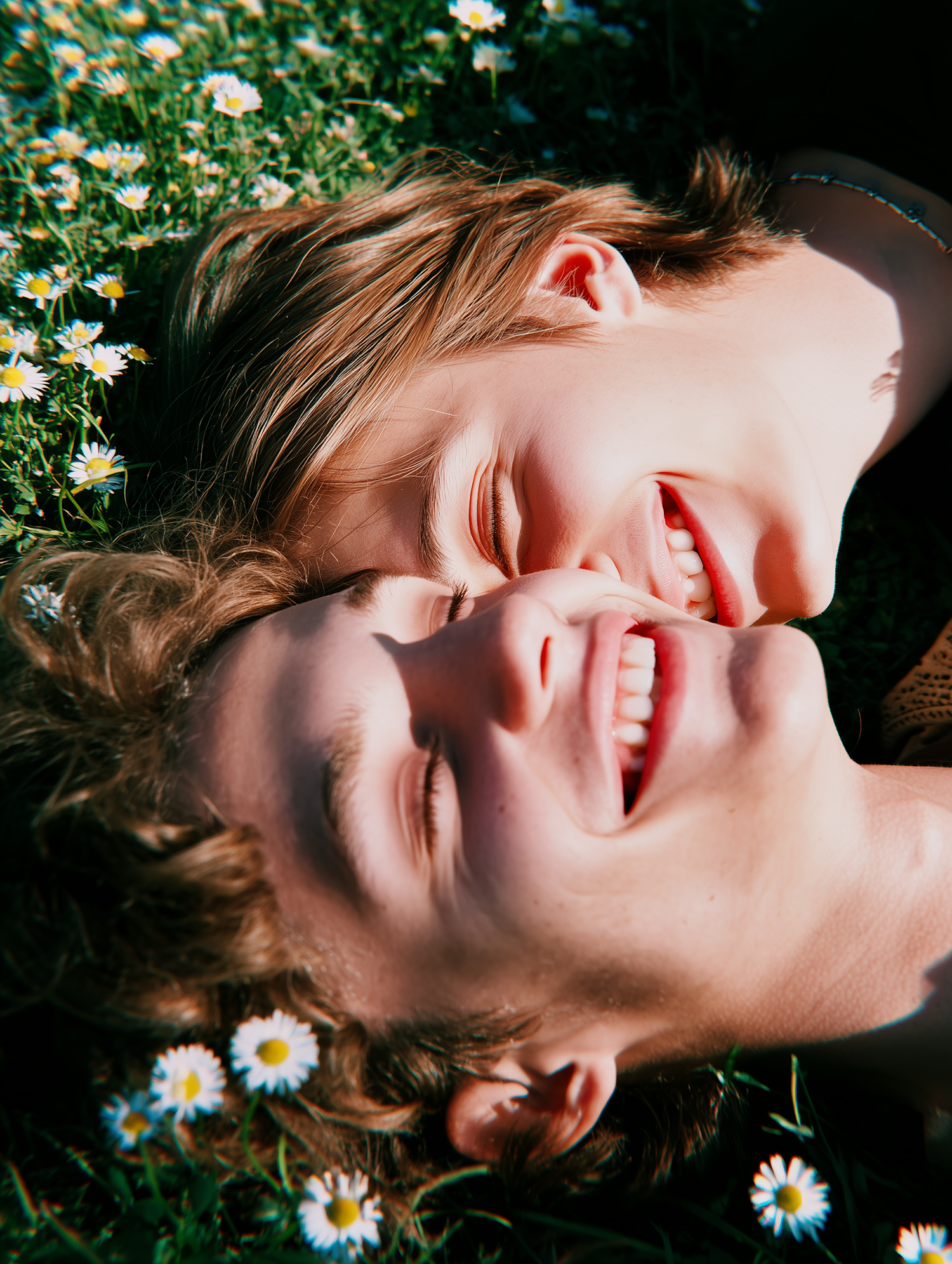 Two joyful people enjoy a sunny day lying amidst daisies in a vibrant green meadow, sharing smiles and happiness.