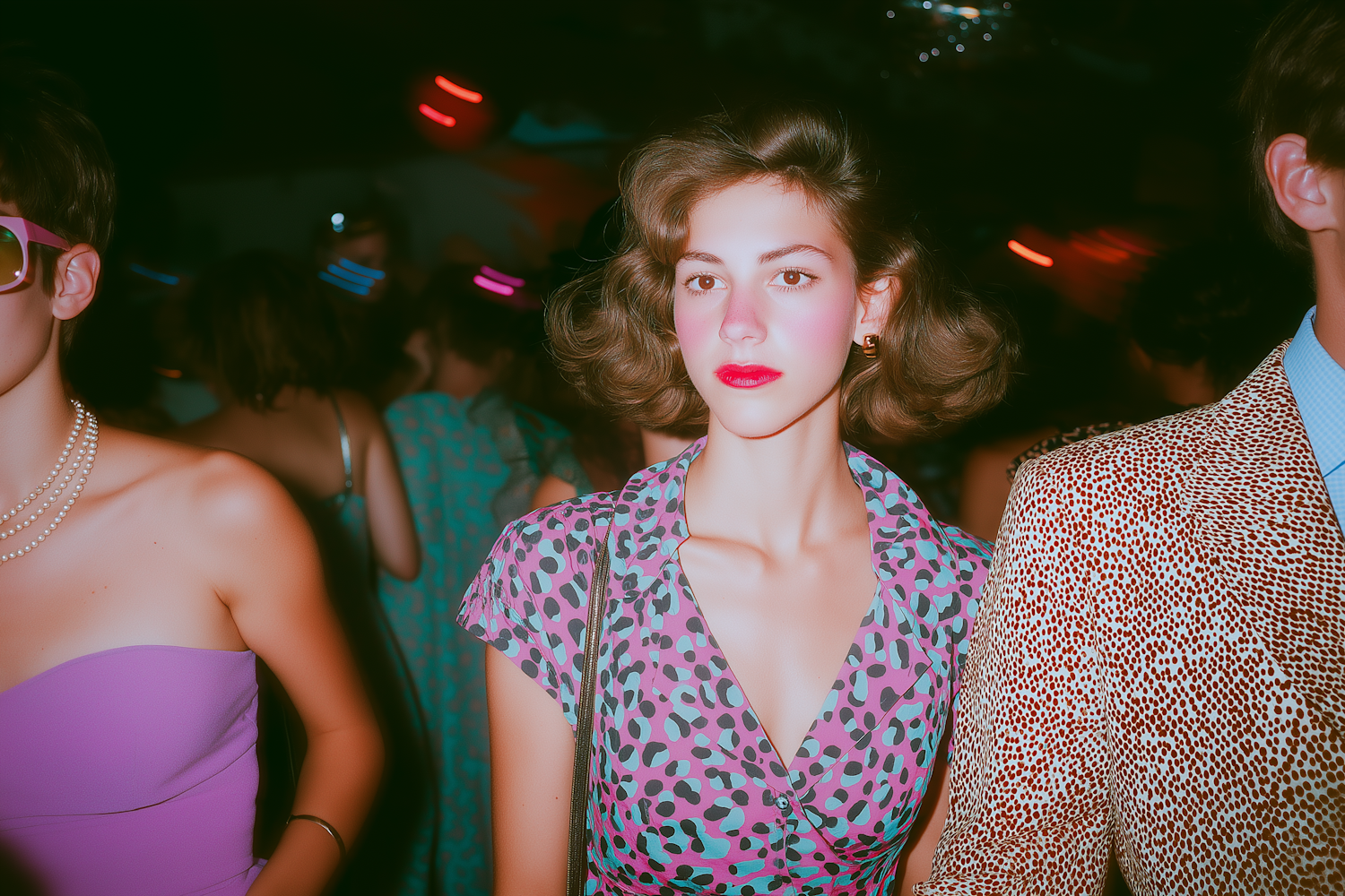 Stylish individuals at a retro-themed party, featuring bold patterns, vibrant colors, and a lively atmosphere.