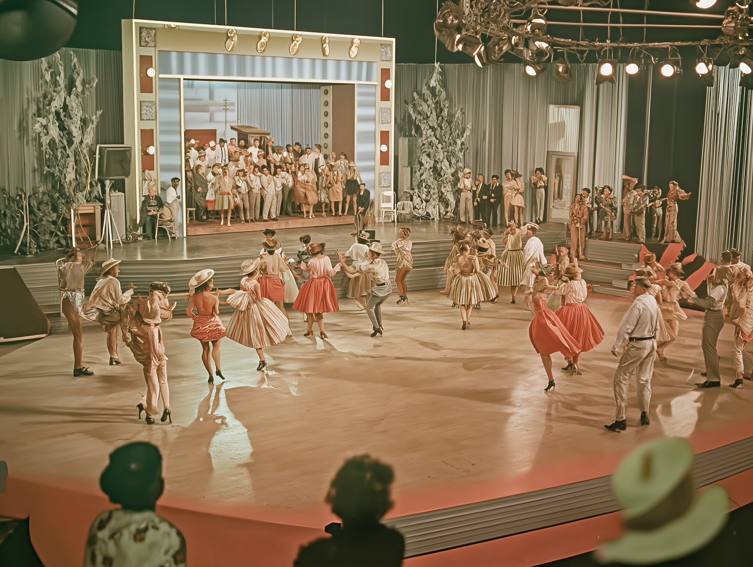 Energetic dance scene with vintage costumes on a well-lit stage, featuring lively performers and a captivated audience.