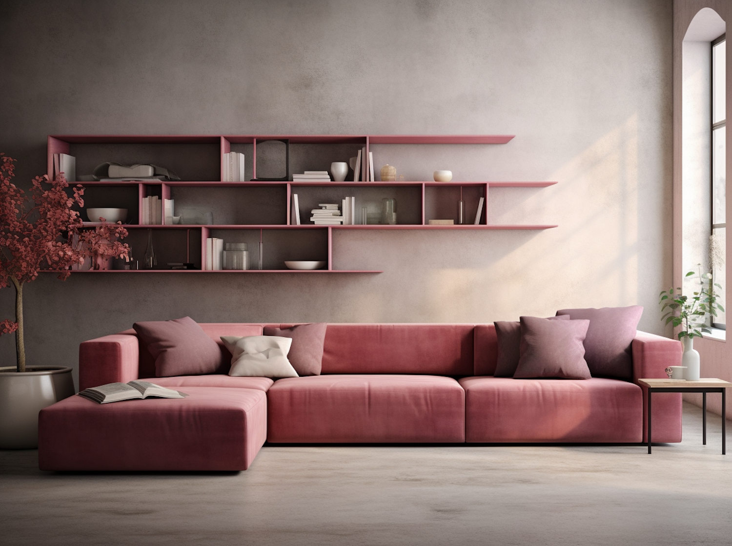 Modern living room with pink sofa, wall shelves, and natural light. Minimalist decor with books and plants for a cozy ambiance.