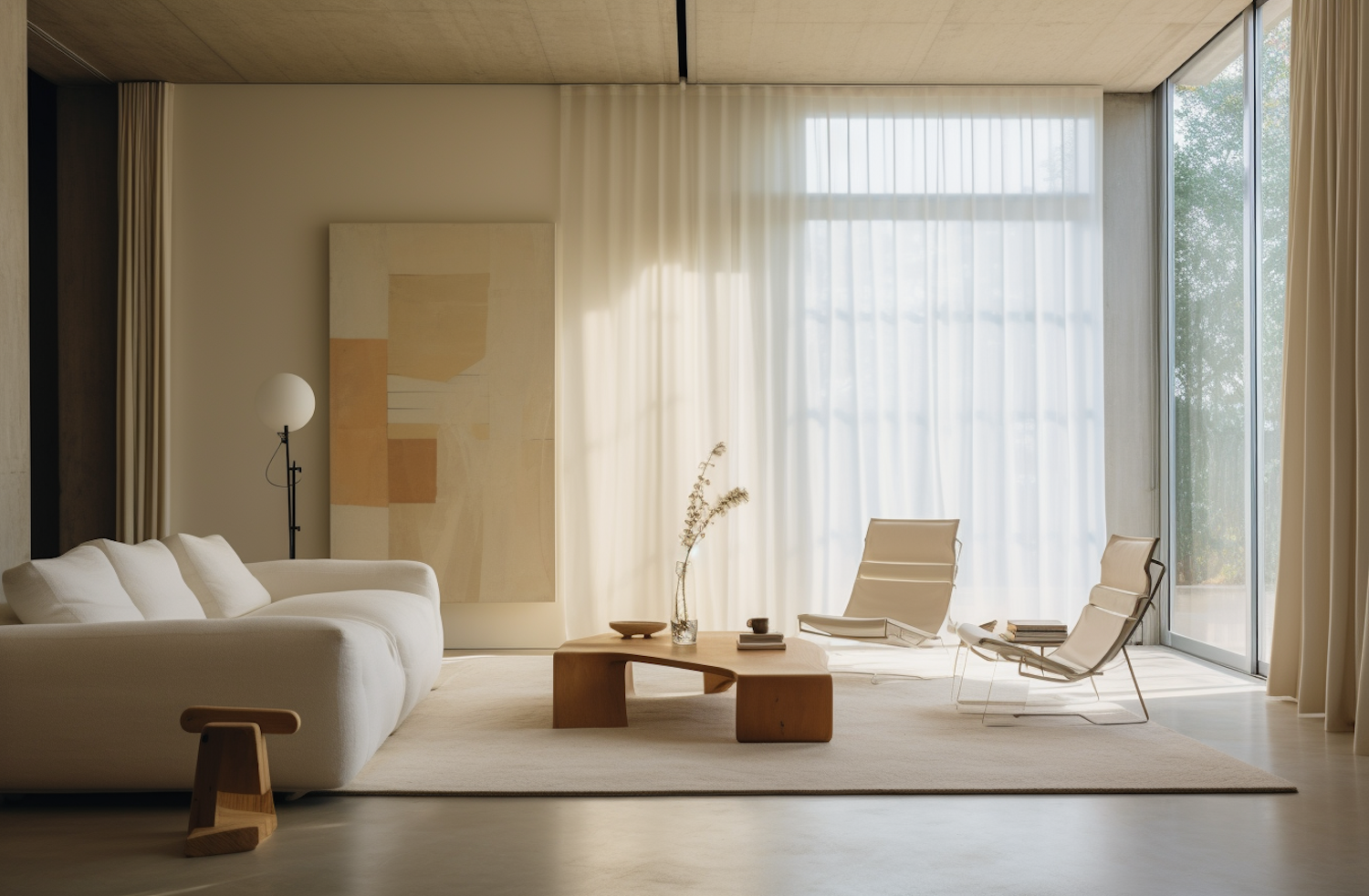 Modern living room with minimalist design, featuring a white sofa, beige chairs, wooden table, and abstract art in natural light.