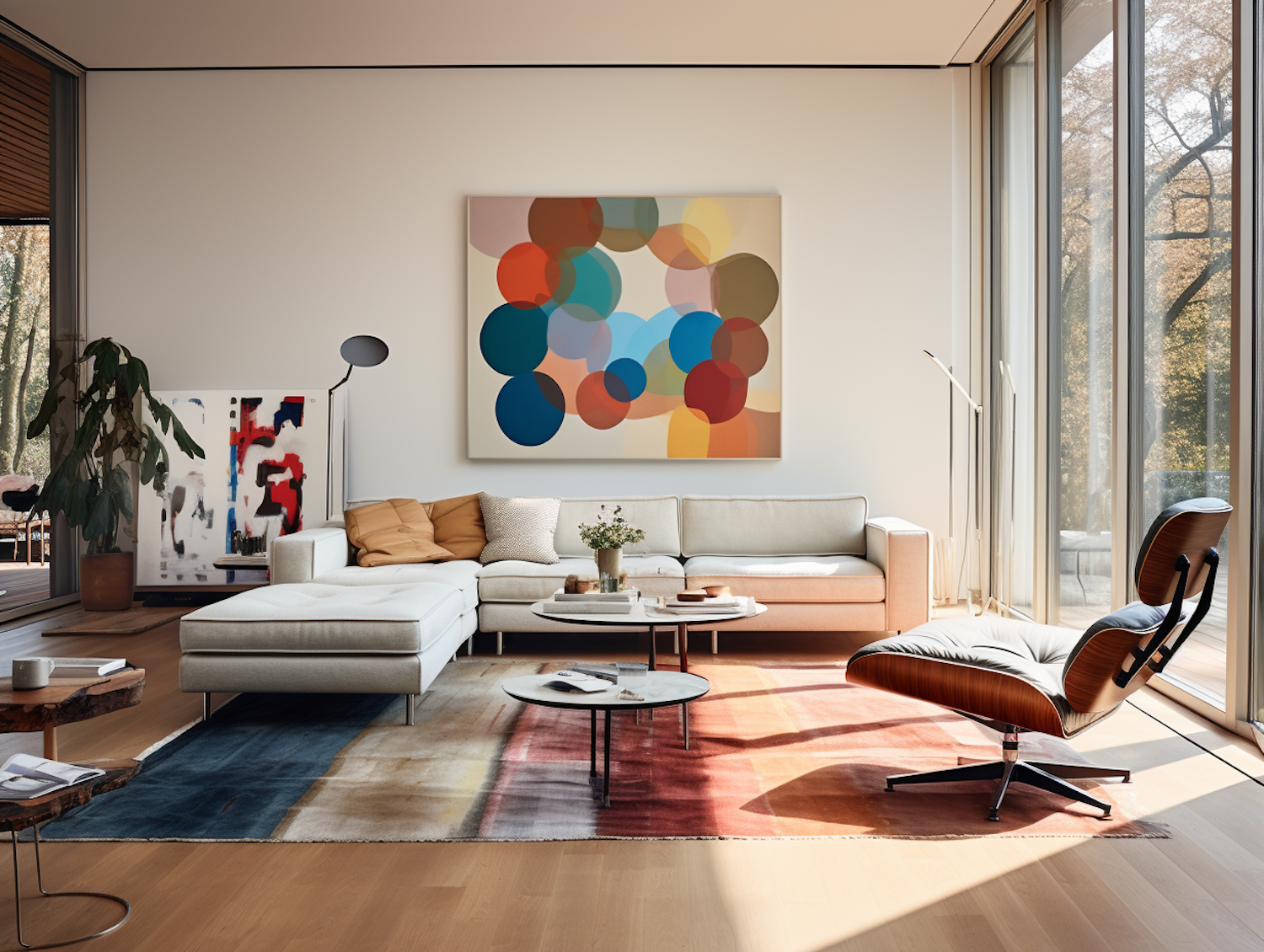 Modern living room with beige sectional, Eames chair, abstract art, and floor-to-ceiling windows. Cozy and stylish interior design.