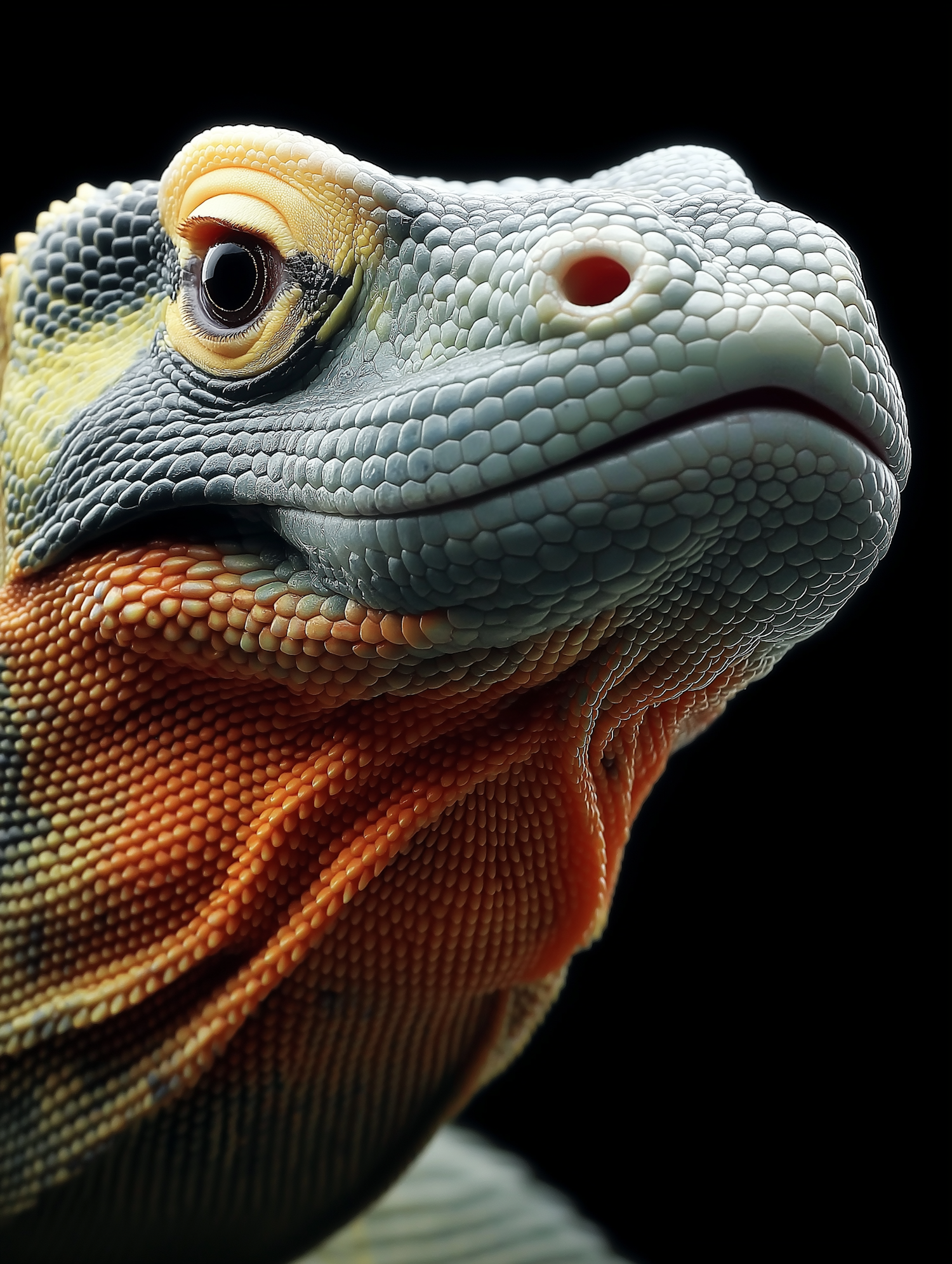 Stunning close-up of a lizard's head with vibrant scales in green, orange, and yellow, set against a black background.