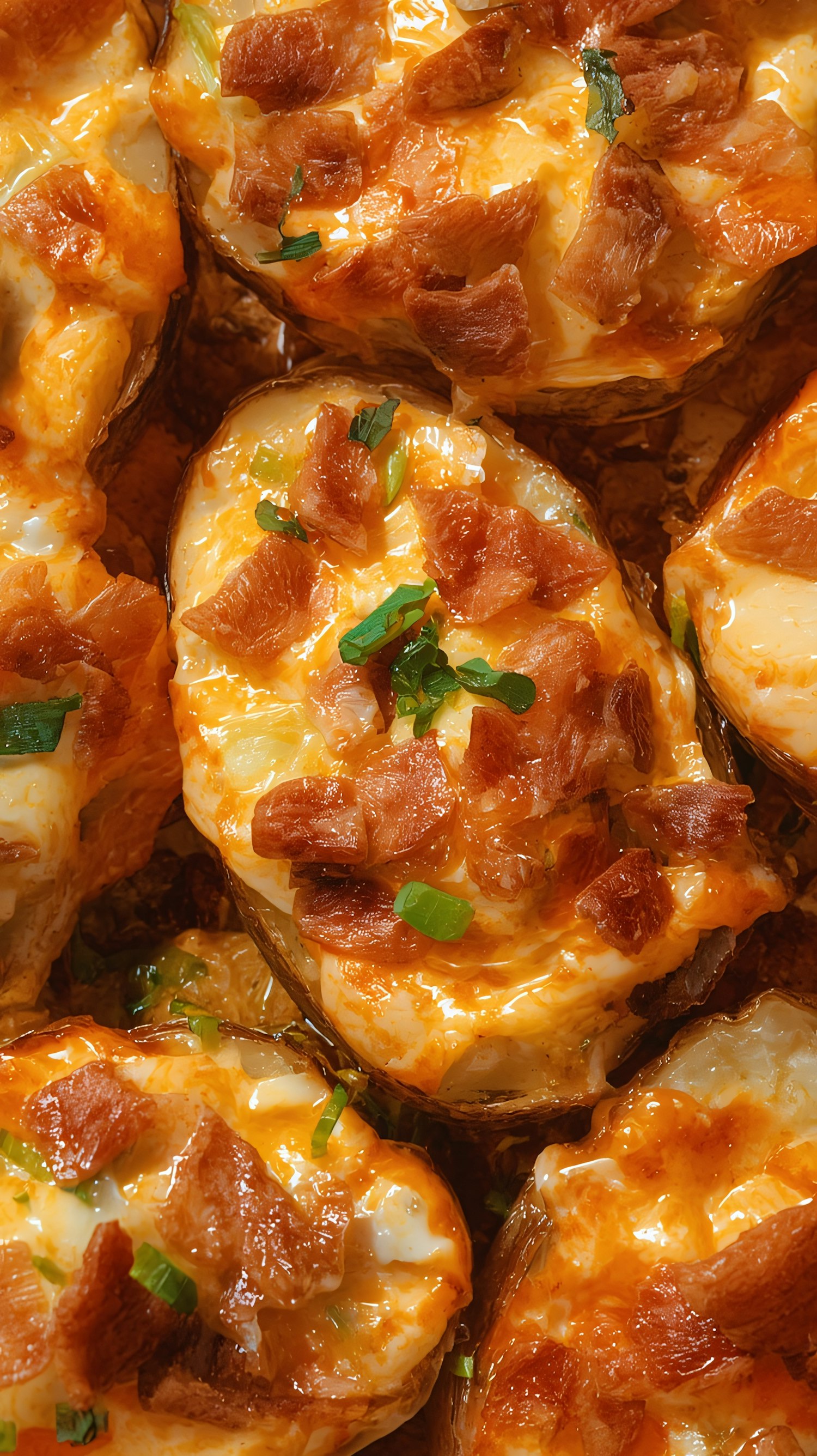 Close-up of loaded baked potatoes with melted cheese, crispy bacon, and green onions, showcasing a delicious and hearty dish.