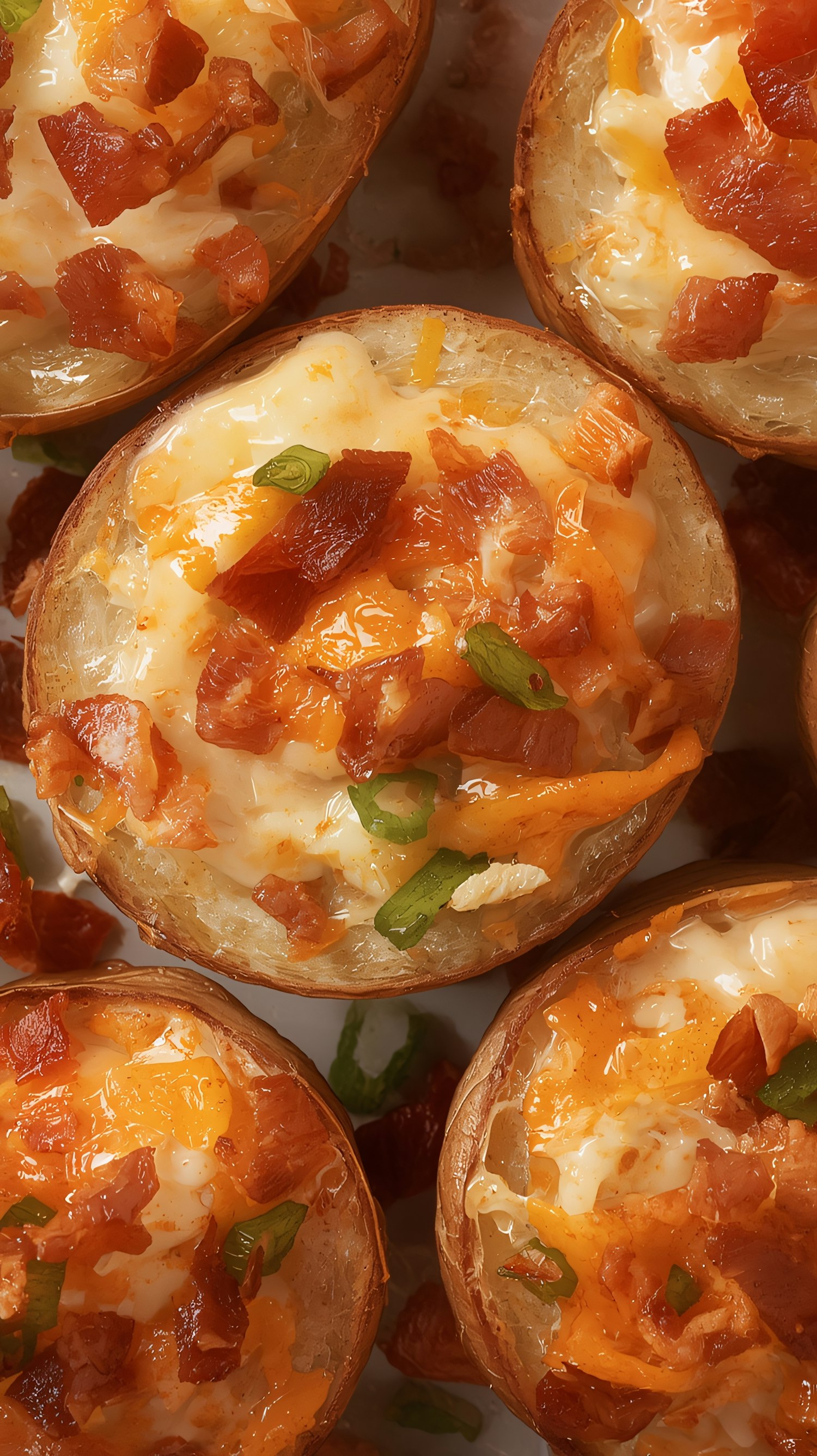 Close-up of loaded baked potatoes with melted cheese, crispy bacon, and green onions, showcasing their rich textures and vibrant colors.