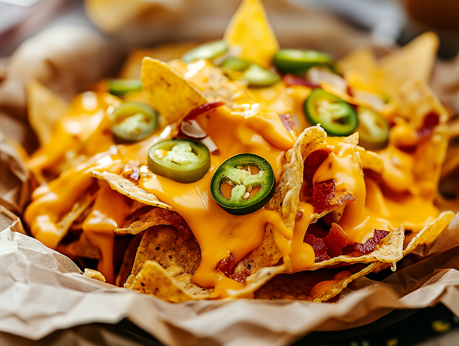 Mouthwatering nachos topped with melted cheese, jalapeños, and bacon on a rustic tray. Perfect for a spicy, savory snack.