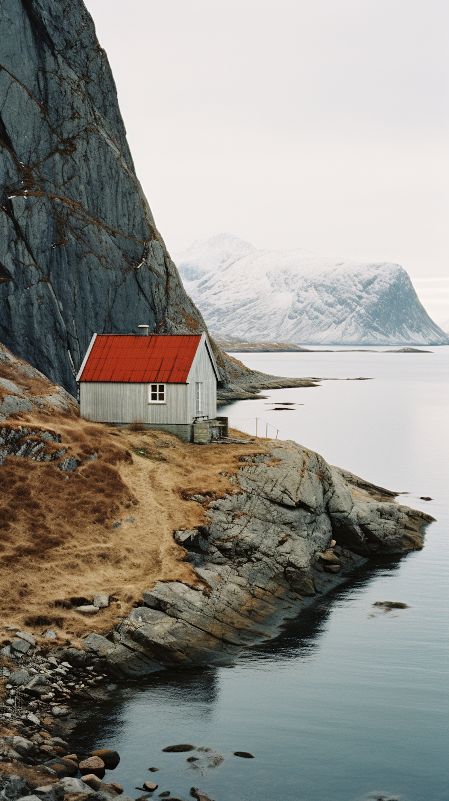 A small house with a red roof on a rocky cliffside, overlooking calm waters and snow-capped mountains in the background.