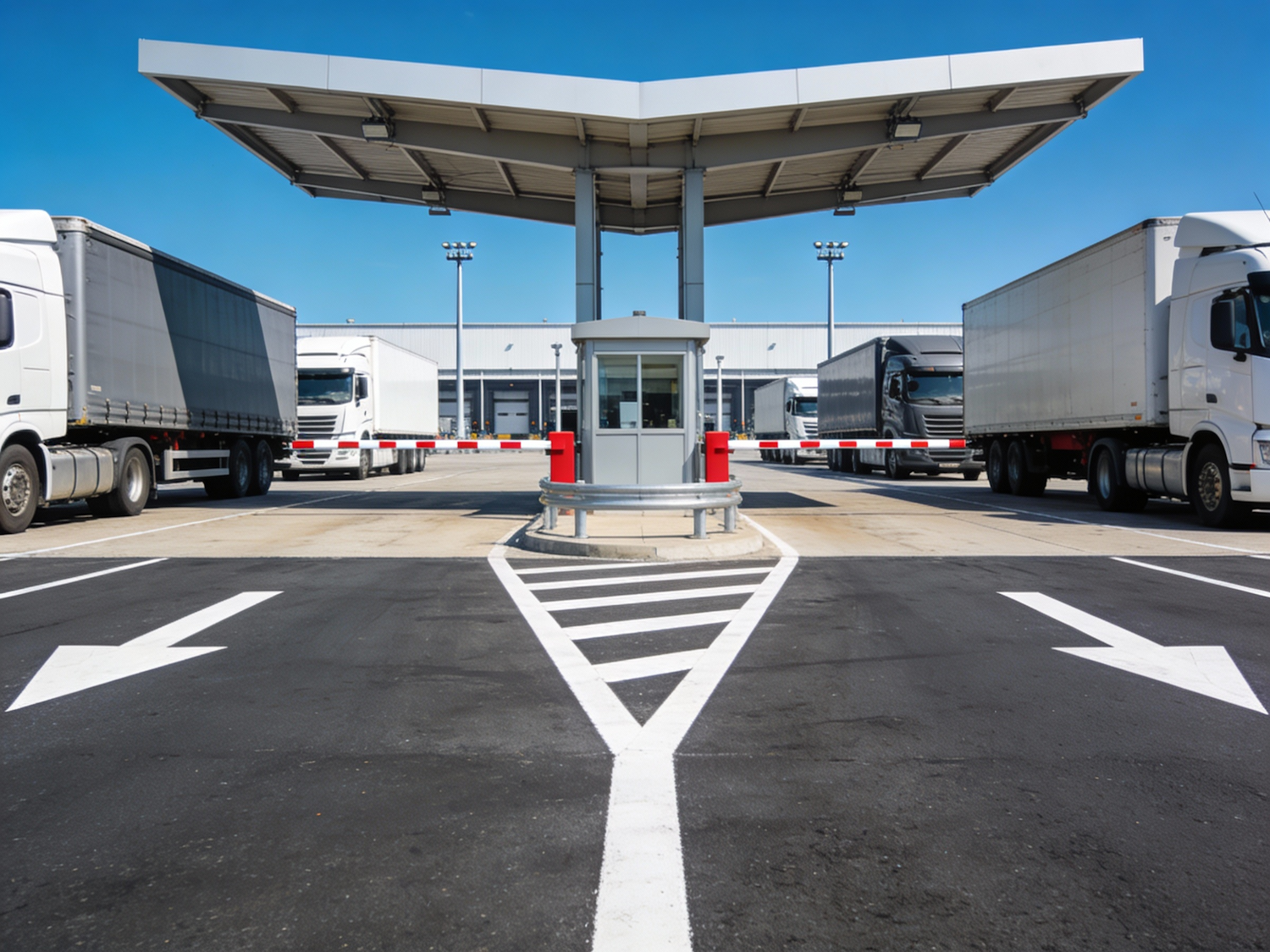 Entrance plaza of a modern logistics hub on a clear day, wide view of a multi-lane access road leading to a security gate canopy; several neutral white and gray semi-trucks queued diagonally, cabs angled slightly toward camera, no logos; dry concrete apron with bright lane arrows and stop lines; small guardhouse and barrier arms in mid-ground; warehouse facades and light masts sharp under blue sky. 24 mm, f/7.1, ISO 100, 1/250 s; CPL for sky depth and controlled asphalt glare — moderate rotation only. Negative: gray haze, over-clarity on vehicles, halo on guardrails, metallic color shifts.
